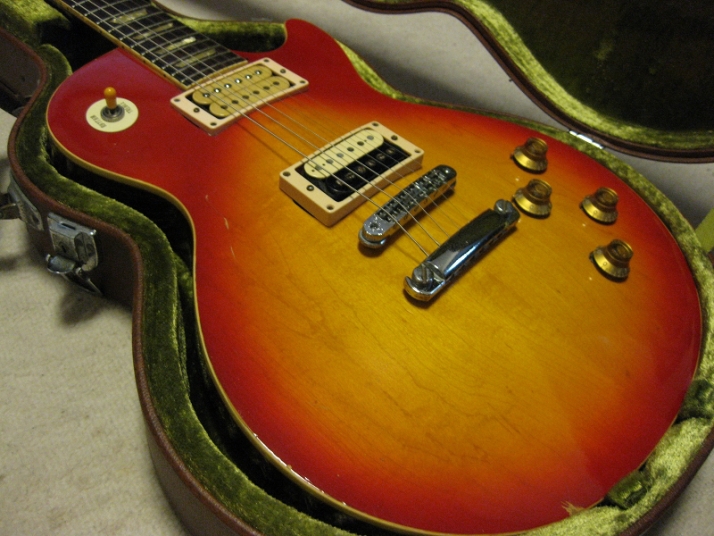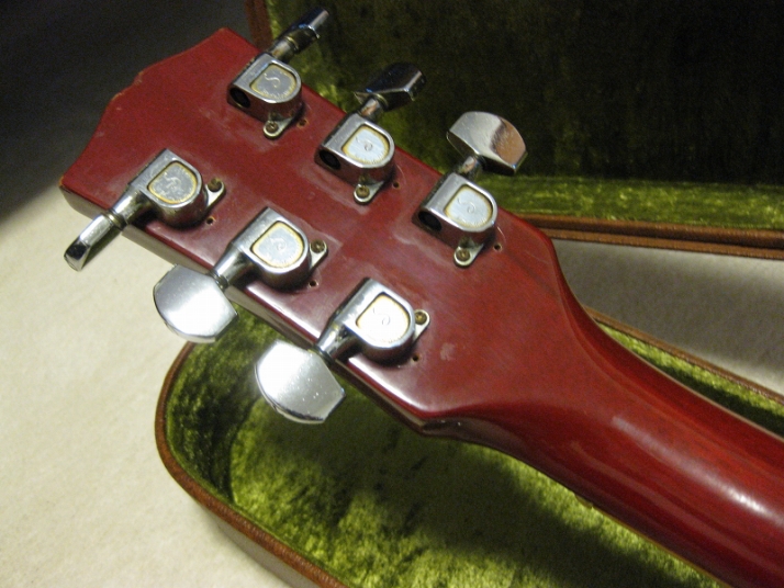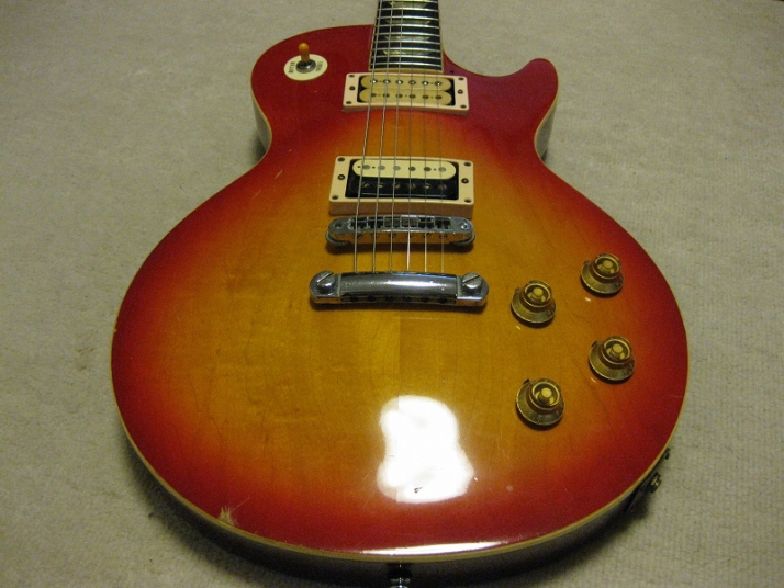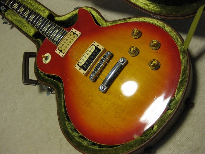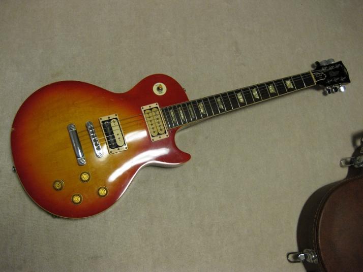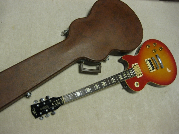 | Fernandes FLP 1978-79 Tokai Made Les Pual STD Model This should be FLP-50, 60 or 70... I could not specify the modeling. The previous owner have changed the tuner to Shaller, and Bridge PU to Duncan. Probably, 70 class guitar. As you know, Fernandes asked Tokai to supply several modeling in 1978. This is Tokai made Les Paul STD. I have another FLP. It shiuld be same but the brown color. The position inlay of these guitars are east to peel down. This guitars' also looks repaired. The neck is straight and frets are proper condition (got worn, but still O.K.) with C grip. Not really thin. The truss rod is O.K. The nut width is almost 43.7mm. The body is Maho 2-3P. Top is 2P maple. It is 4.81Kg weight. The parts are changed a bit. 1) Tuner --- shaller 2) Bridge PU --- Duncun 3) Volume Pods --- CTS. 4) PU Mount Rings Well, the looks pretty good still. The sound, of course, Les Paul sound. I thought to change this guitar like Jimmy Page Model But I didn't because of current good tone. The brown hard case shown above will be delivered wit this guitar Please try JV guitar !!! |