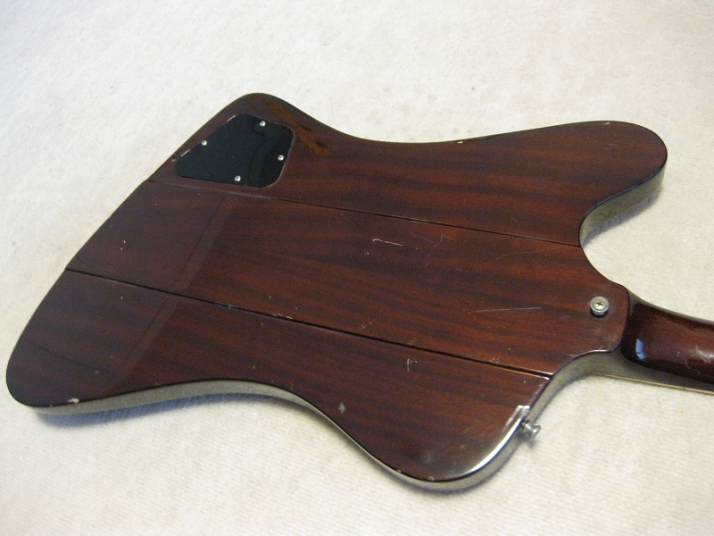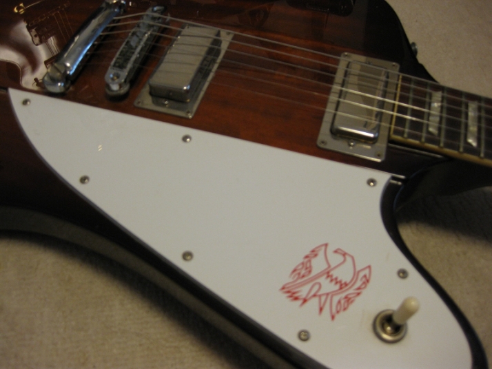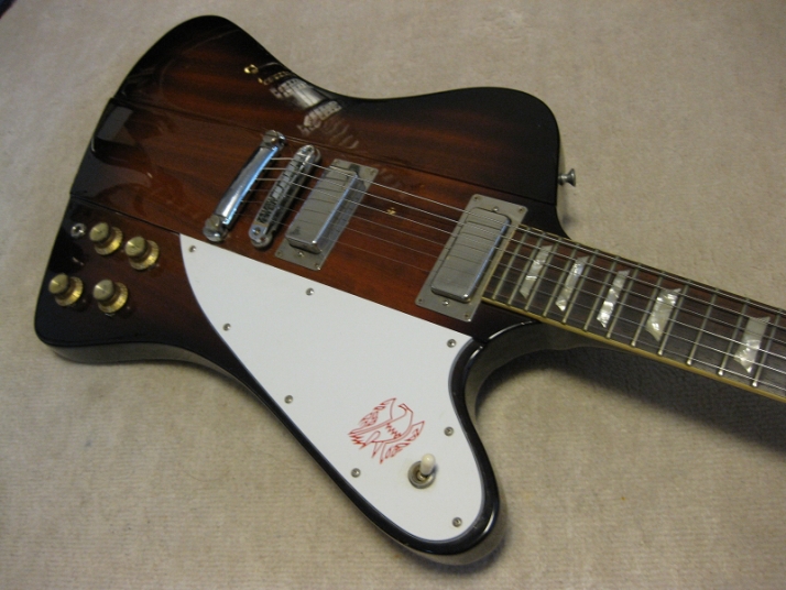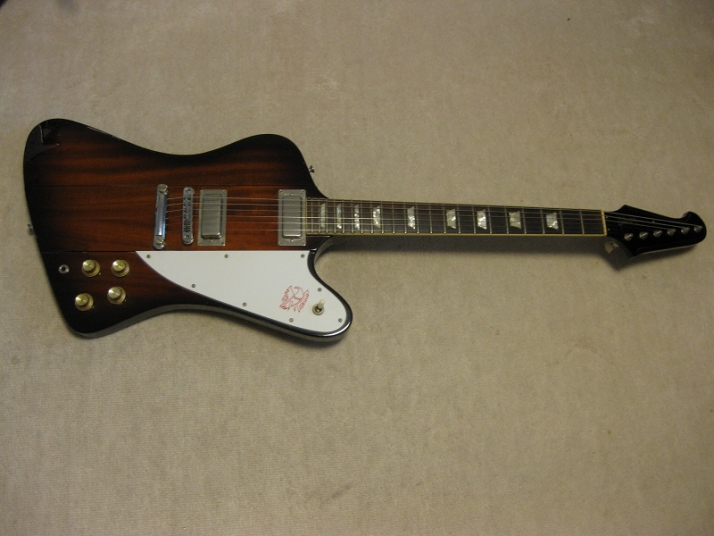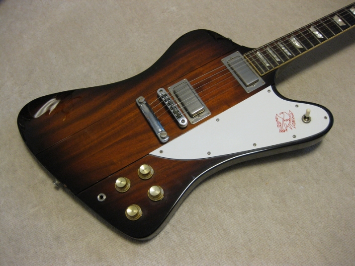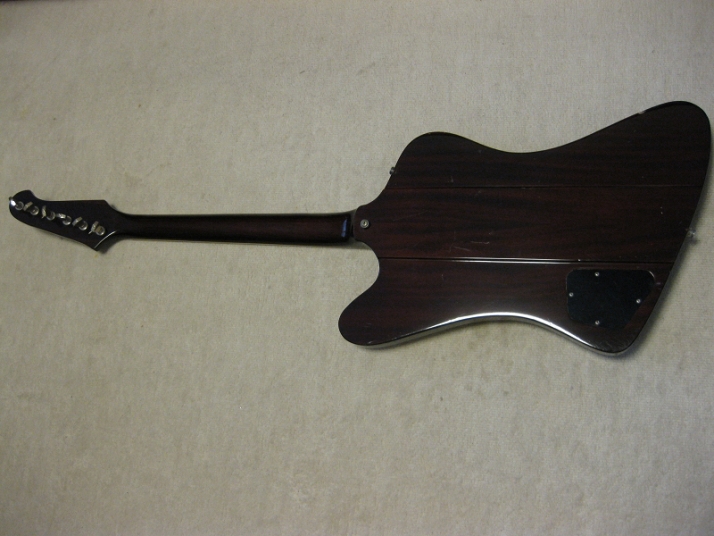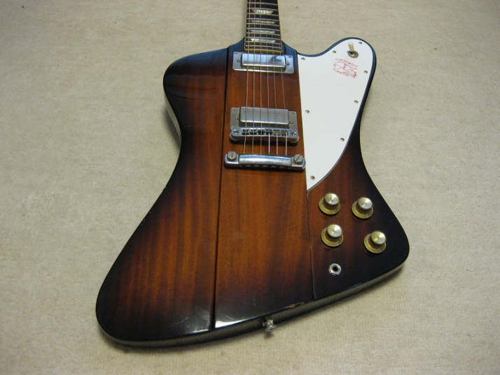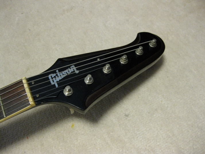 | Fernandes 1981- made Revival Series Firebird model First of all, this is not Gibson Firebird. The previous owner took off and lost it. I have bought the replacement of Gibson type and put it on. This is 100% Fernandes Revival Series Firebird made in 1981 or a bit later. They made this guitar as greater replica. The made even tuner (I guess. it should be by Gotoh The current Gibson model is same, Gibson asked Gotoh to supply as OEM). Pretty good condition. There are some small dents and scratches, but generally great condition. The neck is straight and frets are good condition, maybe not played so much. All Maho body. The neck is set in neck. The weight is 3.6 Kg. The nut size is 43.6mm approx. Currently, the strings are set pretty low action. Greatly smooth. All original condition except the rod cover. The electric wiring is fine. The PU, I felt the bridge PU is slightly weak output compare with neck. I'm not sure the reason. We will deliver this guitar with Gigbag (not original, use type). Also, we could offer the Gibson Original Firebird hard case --- used, but pretty good condition like brand new, almost at US$ 130.00 The total weight will be changed like 12Kg with hard case. don't have the case for this guitar currently. If you need the hard case, we could arrange the interchangeable type case. If you could accept the gig bag, we would arrange the case which Firebird can be put. Well, Pretty good tone guitar for blues!!! This is good t JV guitar! |