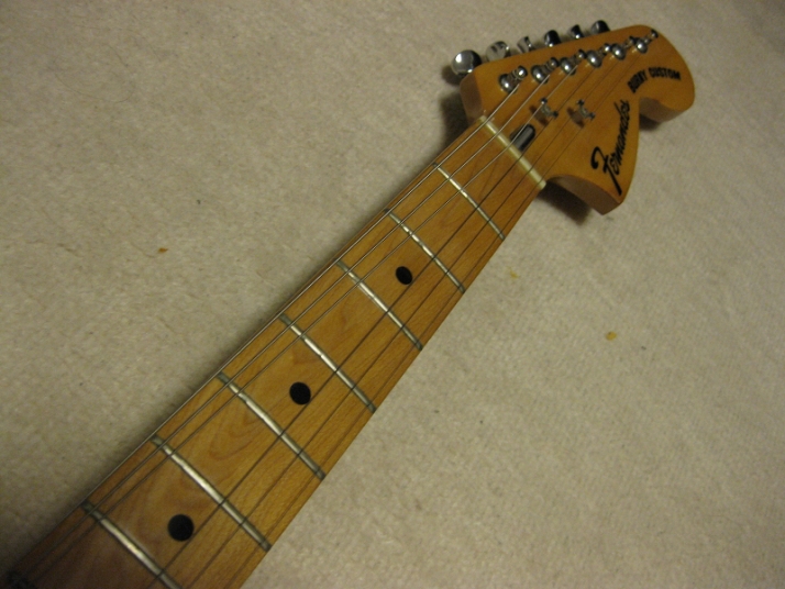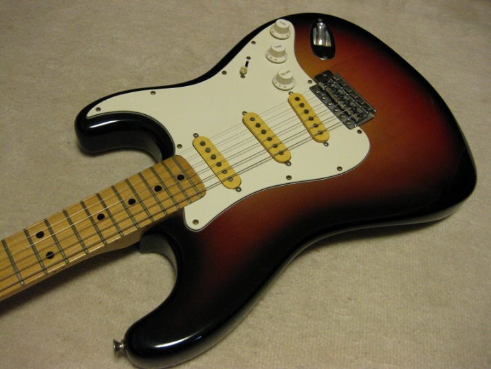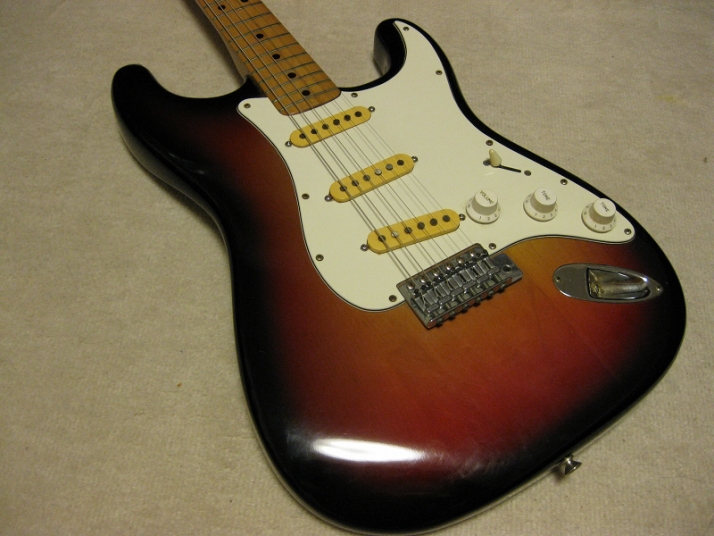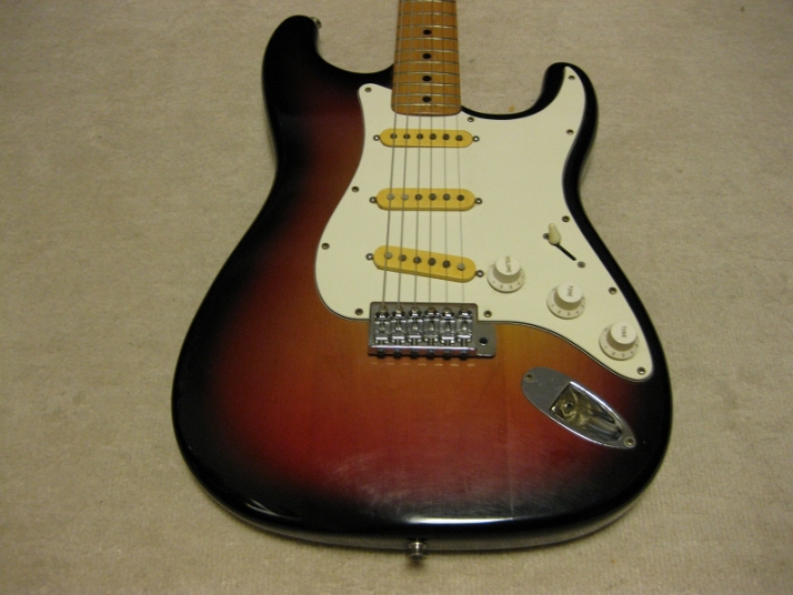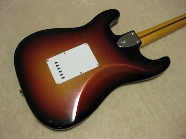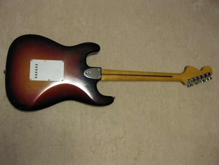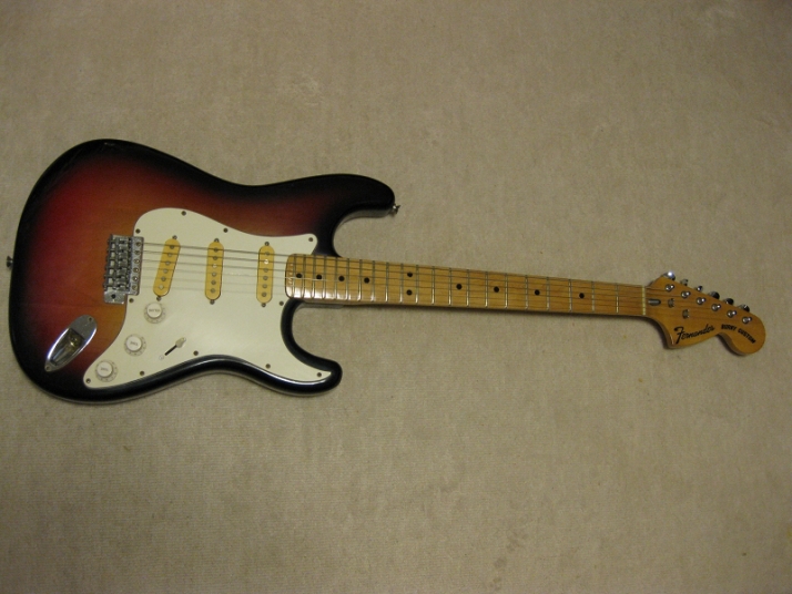 | Fernandes 1975 Kawai made Stratcaster model This Fernandes strat is earlier Kawai production. It has the bonded Maple Finger board and very heavy weight body with Silver heart body in 2PLY 3 P body. I think they refer the weight of Fender USA original that time. It seems that all original condition. It is pretty dry tone. The weight is 4.42Kg the nut width is approx. 40mm. Well, 35 years old guitar. The condition of body are pretty good. I rated this guitar as mint condition. If you are collecting all era Fernandes, this could be good for earliest Fernandes Stratcaster. If you would like to know more about Fernandes, please visit our WEB site. You could see the detailed. We are going to ship this guitar with soft carrying case. This is good t JV guitar! |