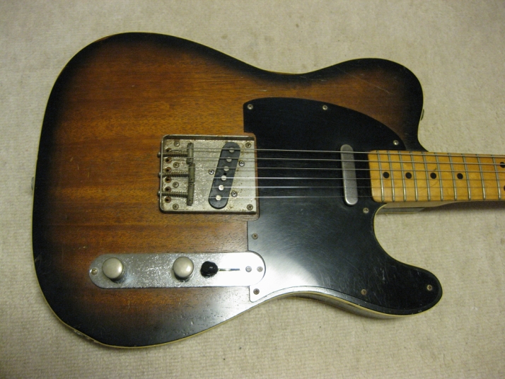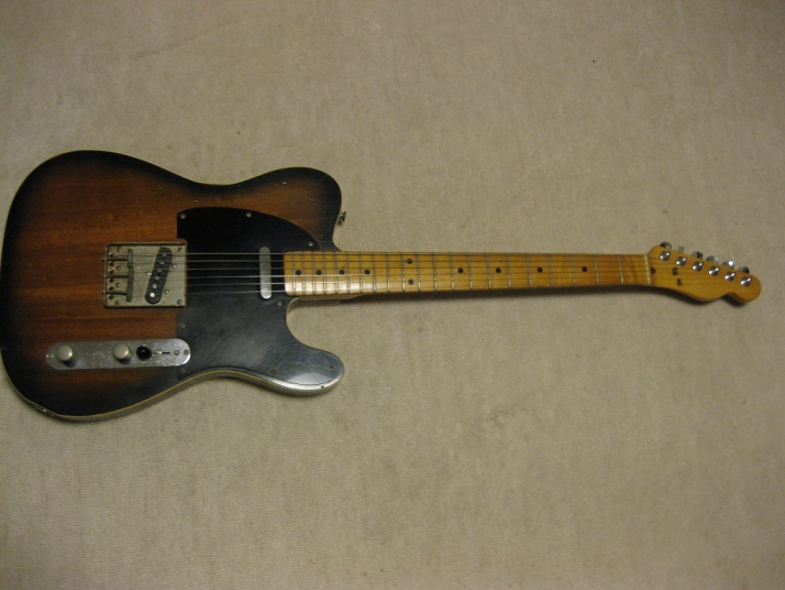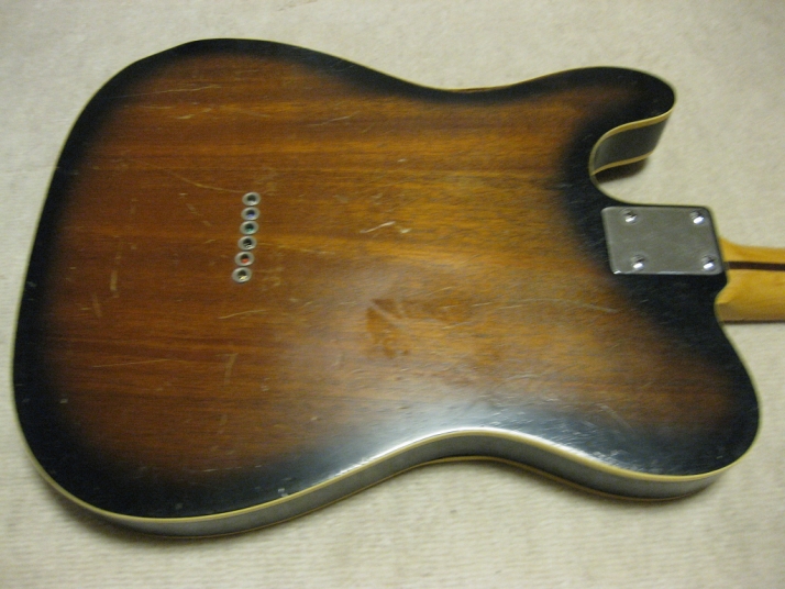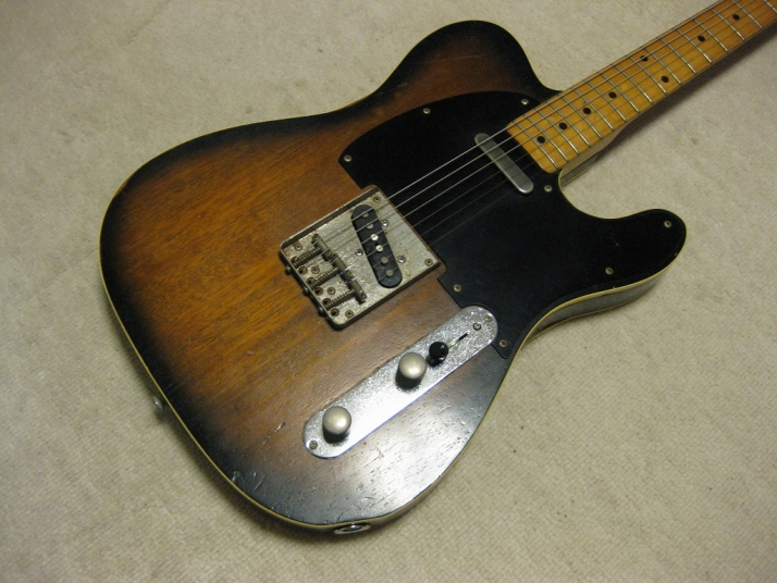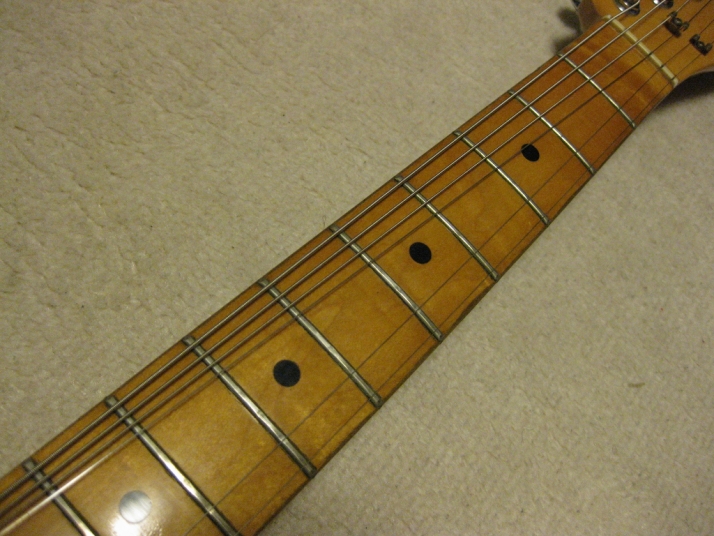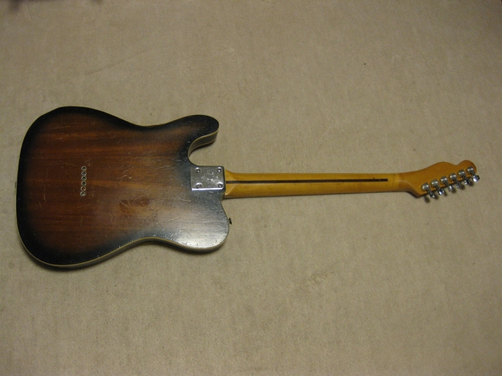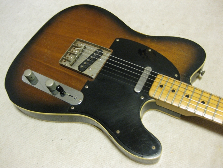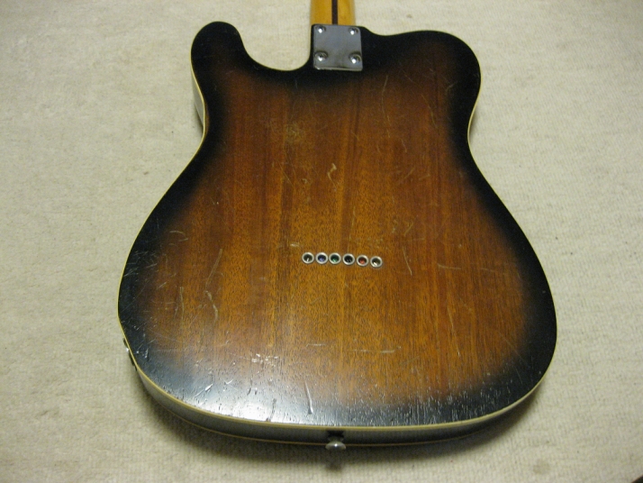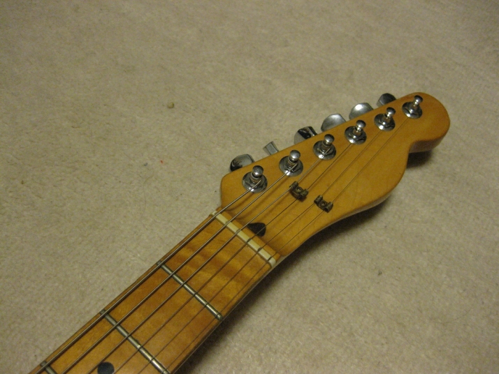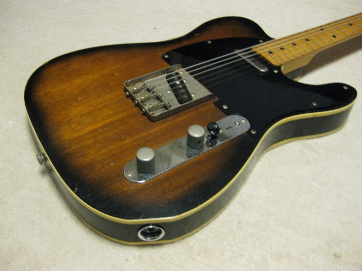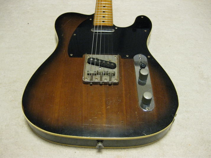 | FERNANDES FTE-70 Maho Body Telecaster Model 1978-79 made This guitar was made in maybe 1978-79 time. Fernandes made many good replica before their revival series. This is one of good example. Many Players here loved Fernandes made Fender Replica. I guess their sales was very good. They started to produce the custom made guitar too. This is sort of their custom made, but has a good wood material in use. When I get this guitar, it is very regretfully, the previous owner took off the brand name. We could see still thin pattern as Stone Logo on head. Beside this, this is good condition guitar. I have changed the selector switch to Oak 3 way. The original one didn't work. The neck is 1P. It is straight with 41.5mm nut width. The body is Maho I'm not sure how many piece of wood. Probably 3P. Its weight is 3.37Kg. The body has many dents and scratches. The paint of this guitar is very thin. It is not Poly. Fernandes said it is black sunburst violin finish. I don't know which paint material in use. However, we could see the fibre tracheid. The electric circuits were checked and it is fine. I like this guitar's tone. It is very warm and clear on the neck PU. Maybe, most of players will have same impression. No Brand name on. This is only reason I rated "Fair". Try good time JV guitar ! |