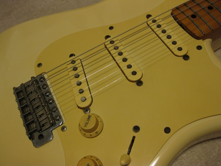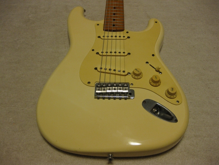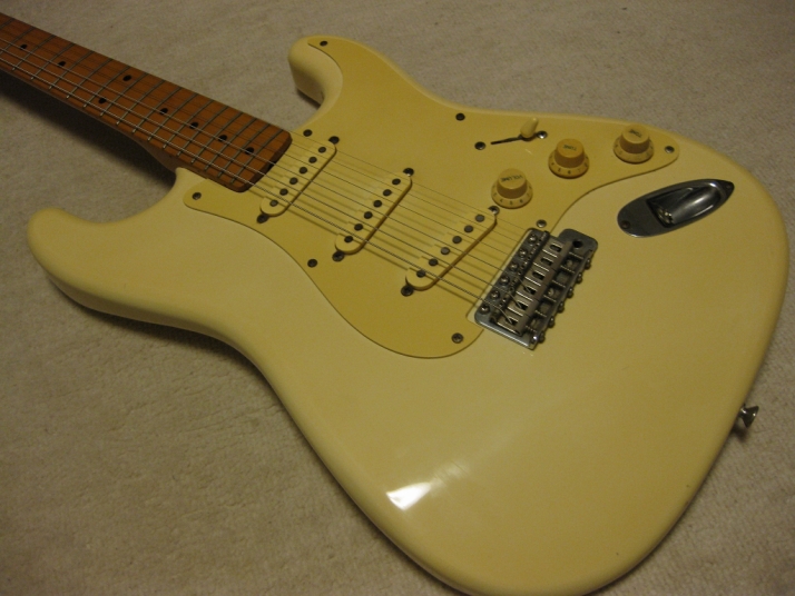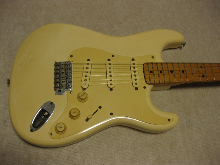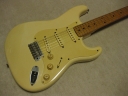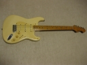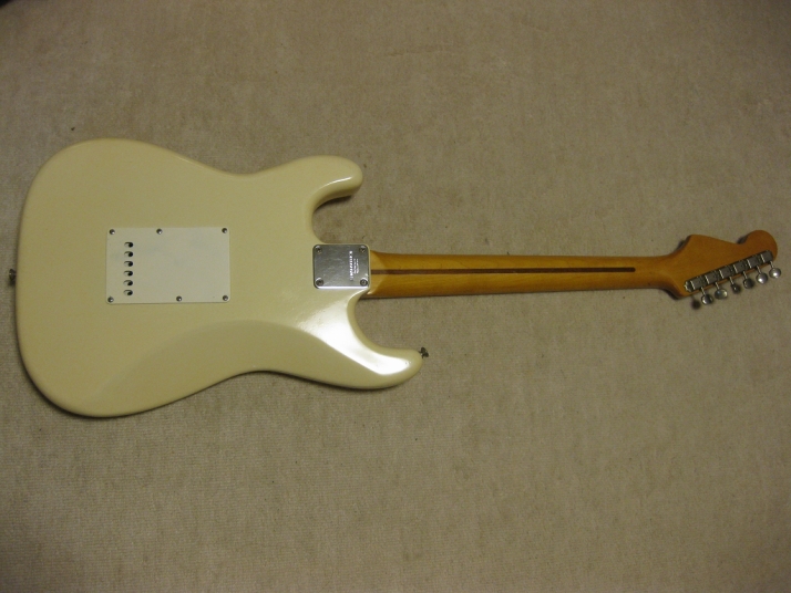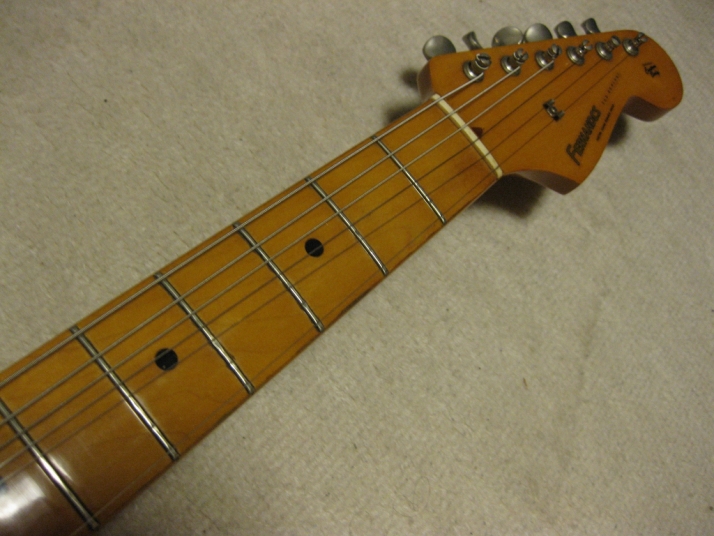 | Fernandes Revival RST-50 Stratocaster White This is proper condition Revival stratocaster replica. Well, I rated mint-, because body surface have a bit dents and scratches. It looks like more vintage guitar, anyway. The neck is straight and frets are proper condition (Low positions are bit worn) Good C standard grip Maple 1P neck. The nut width is 41.25mm The body is probably (their catalog said) Ash (maybe 3P). It is 3.47Kg. It is standard weight as stratocaster model. The metal parts are a bid rusted. This is 1st generation Revival, so it should be in 1983-88 made. Of course, the bridge saddles have the revival marked. The tone, it is very good tone, I love. The pick up are all gray bobbin type. This is why many players want to use this series. Pick Guard was changed by previous user, I thought. I have only changed the output jack to switchcraft made. Please try the real JV guitar! We are going to ship the guitar with second hand gigbag. |