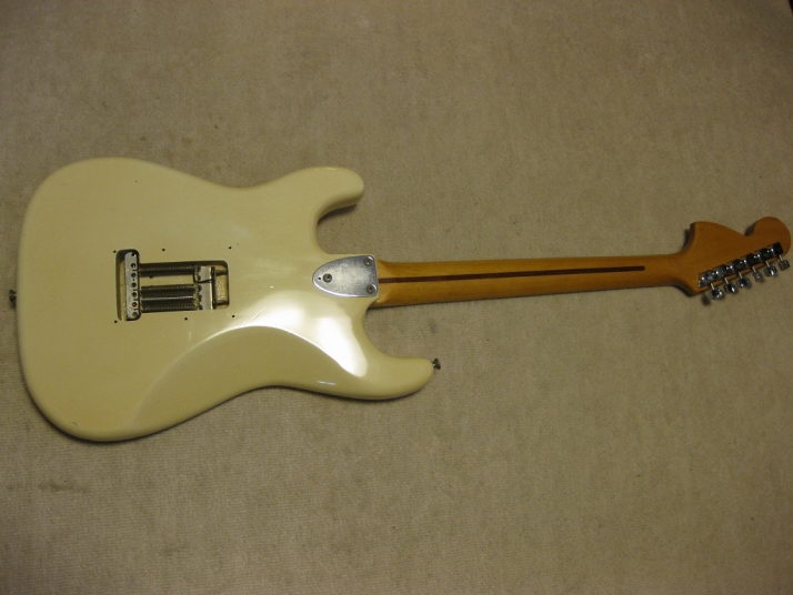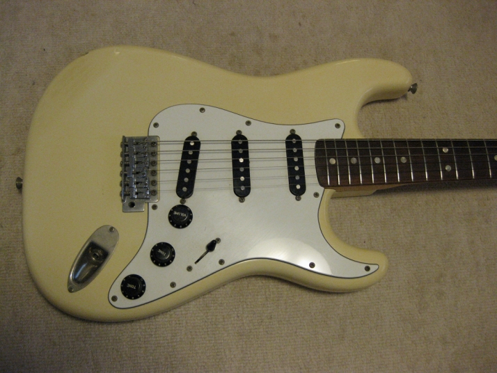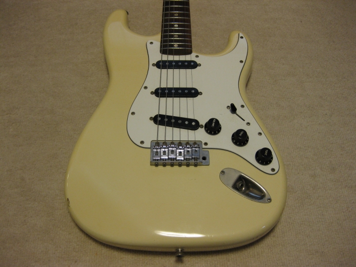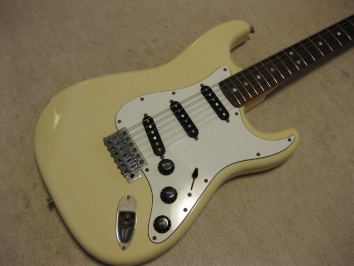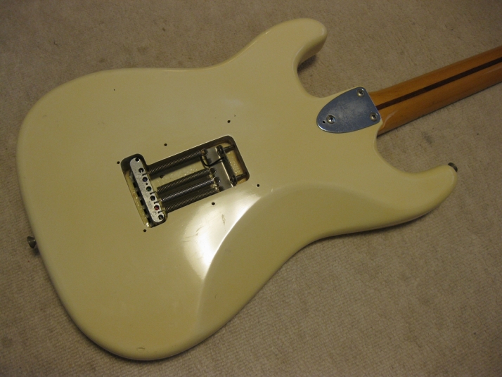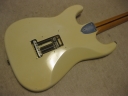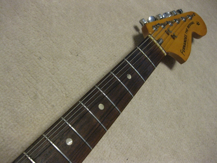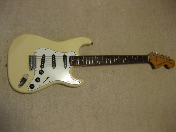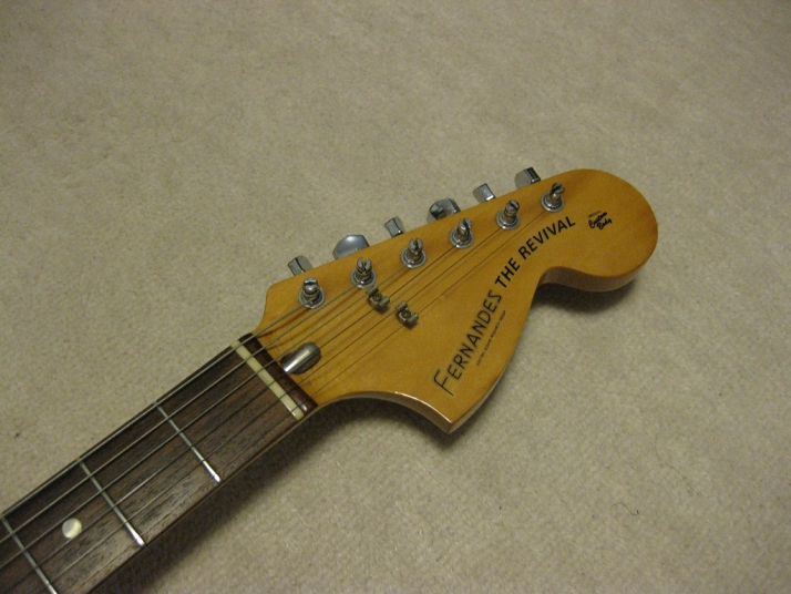 | FERNANDES Revival Stratcaster 76 Model This guitar was made in maybe 83 time. Fernades started their revival series in 1981. They made the vintage model first, then, added 70's style Strat. Well, this is absolutely R. Blackmore's influence. Deep Purple and Rainbow were very popular that time. This guitar is probably original condition. I have checked body inside. The neck is straight no twisting. The skunk line wood is slightly shrinking. So, you could feel a bump. It depends on the player, but if you don't like it, please just polish by #2000 sand paper and compound. Maple 1P with RFB with 41.6mm nut. The body weight is 3.72Kg. The body condition is good. It is good looking. The sound, yes, good start sound... Revival 76 model is a bit tough to find, compare with 57/62 model. Hope, you like this guitar and just play "Hard Rock"! Try good time JV guitar ! |