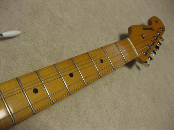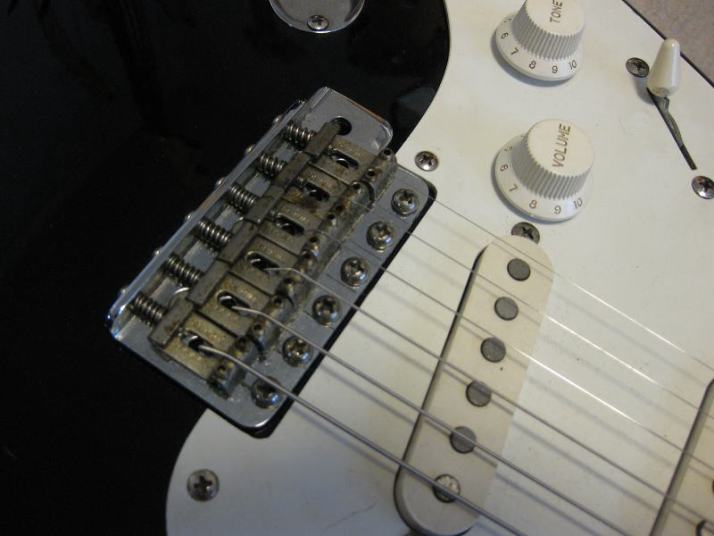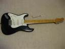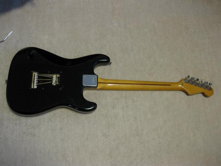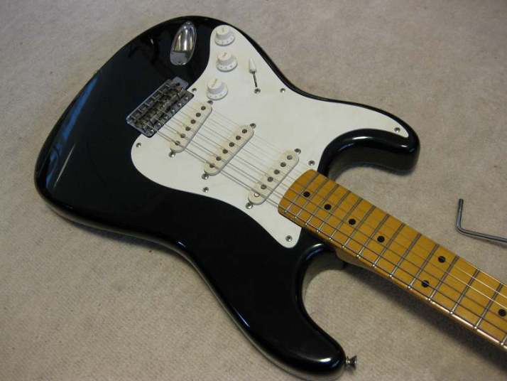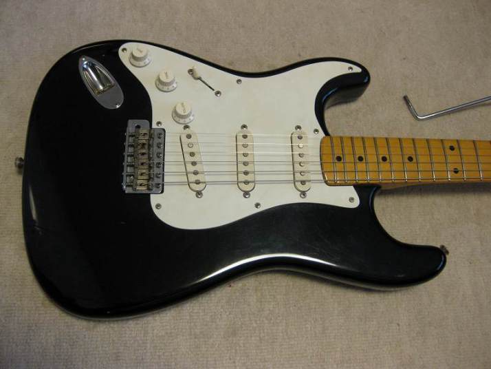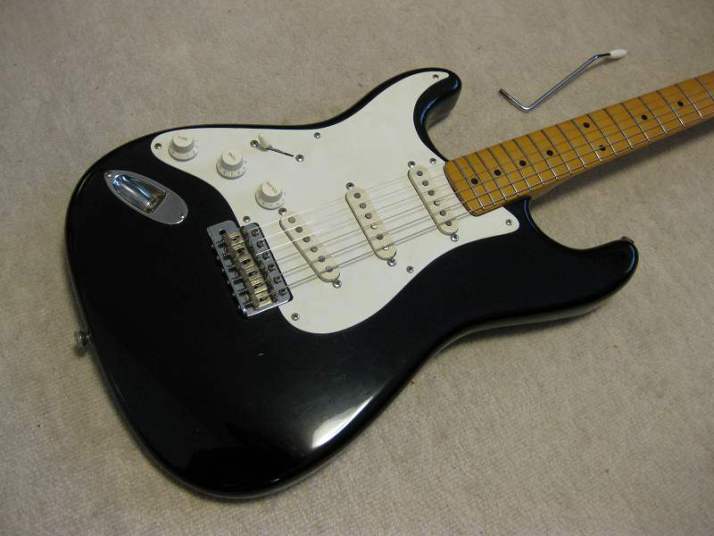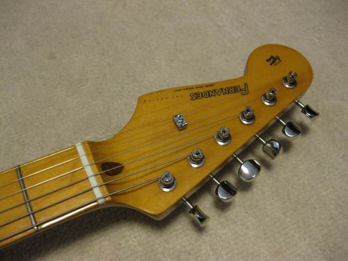 | Fernandes Revival RST-50 Stratocaster Black/Maple Alder Body This is proper condition Revival stratocaster replica. Well, I rated mint-, because body surface have a bit dents and scratches. These are not serious, but not good as Mint. It looks like more vintage guitar, anyway. The neck is straight and frets are proper condition. Standard C grip Maple 1P neck. The nut width is 41.7mm The body is probably alder body(maybe 3P). It is 3.49Kg. It is standard weight as stratocaster model. The metal parts are a bid rusted. This is 1st generation Revival, so it should be in 1983-88 made. Of course, the bridge saddles have the revival marked. The PUs are original Gray Bobbin type. Maybe. The previous owner put the aluminum shielding. I have changed the wiring as left, put the new Orange drop capacitor. The nut was changed to the left playing (the previous user used it as right handle). Please try the real JV guitar! We are going to ship the guitar with second hand gigbag. |