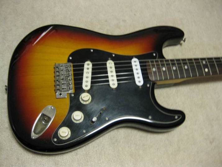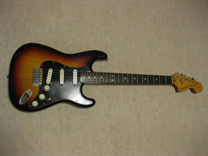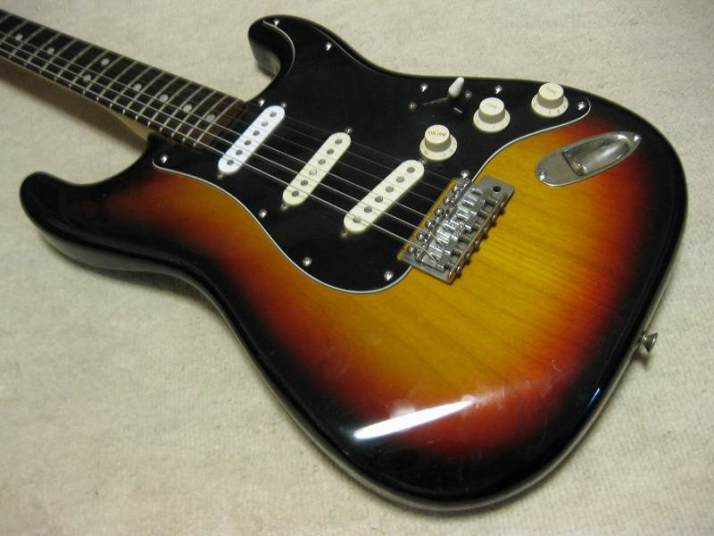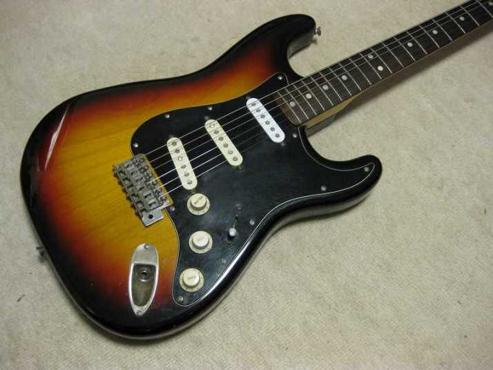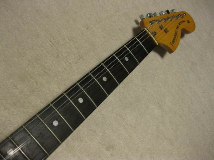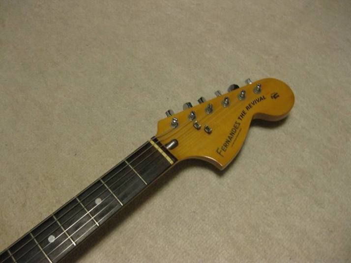 | FERNANDES Revival Stratcaster 76 Model This guitar was made in maybe 83 time. Fernades started their revival series in 1981. They made the vintage model first, then, added 70's style Strat. This guitar is probably original condition except PU cover and knobs?. I have checked body inside. The PUs are probably original, Gray bobbin type. The neck is straight no twisting. Maple 1P with RFB with approx. 41mm nut. The body weight is 3.56Kg. I think the body weight is lighter than original Fender USA! The body condition is good. It is good looking. The sound, yes, good start sound... Revival 76 model is a bit tough to find, compare with 57/62 model. Hope, you like this guitar and just play "Hard Rock"! Try good time JV guitar ! |