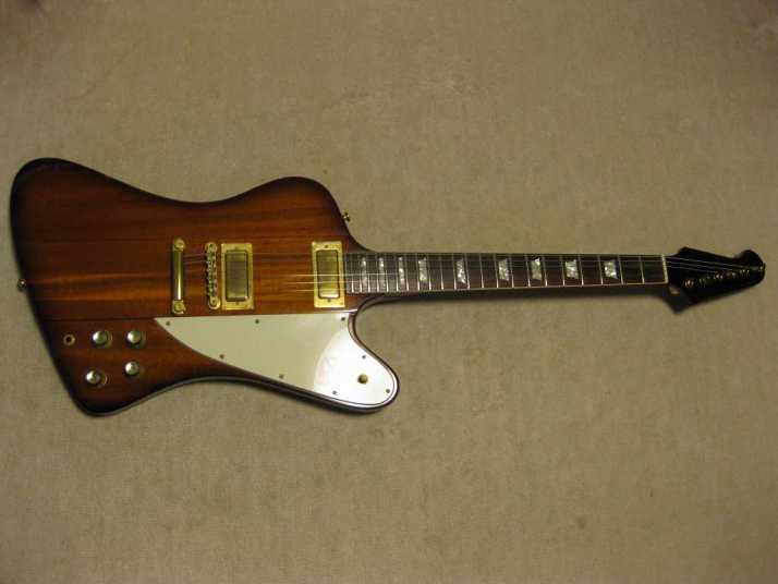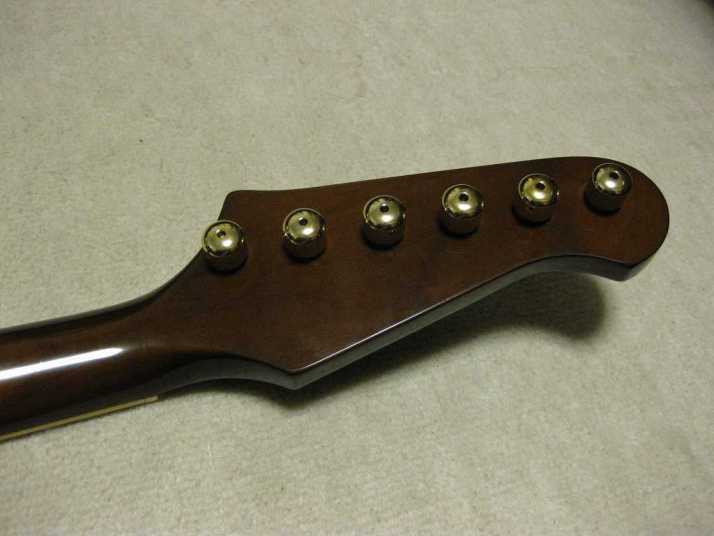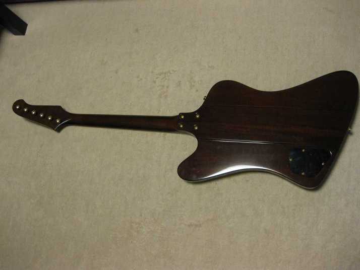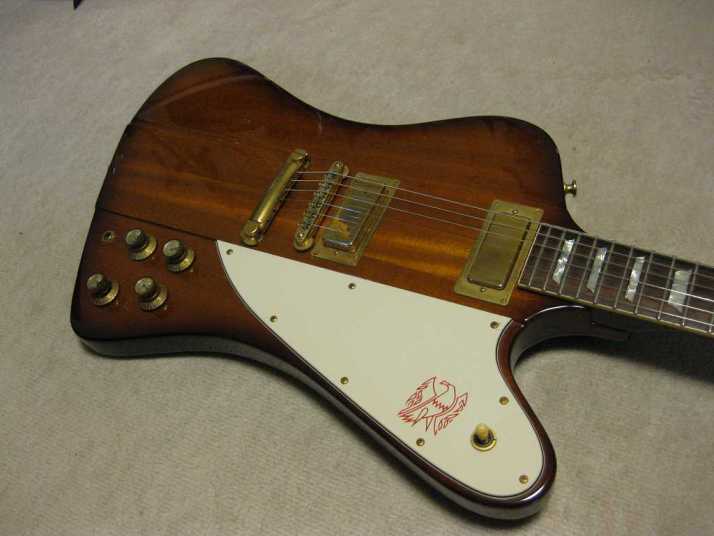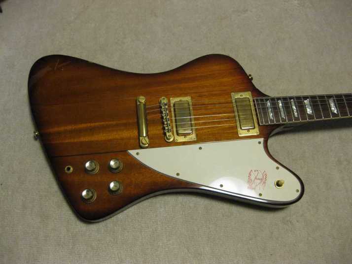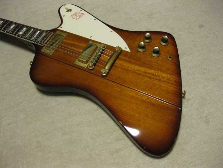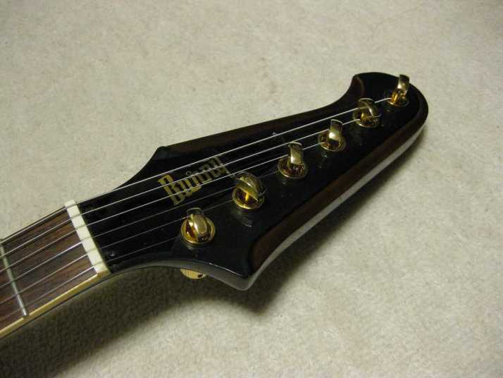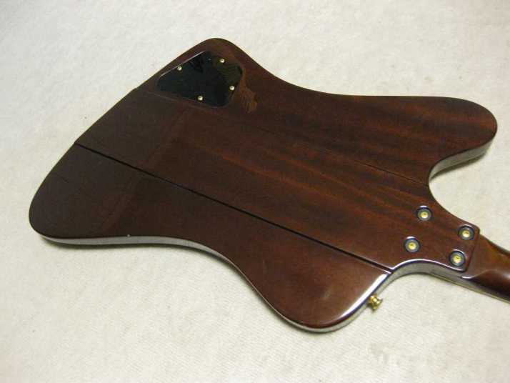 | Fernandes RFB Firebird Model This Fernandes Firebird is bolt on neck type. When I got this guitar. some of tuners were working not well. So. I put the Steinberger Gold Tuner (Brand New). This is very accurate tuning. The tuning became very stable. After that, I have been playing this guitar at my office often. This is very good playing guitar. The condition is so so. body has scratches and dents, but not really serious. The frets are O.K. Neck is straight and very low action. As I said, this is bolt on type neck. The nut width is 42.3, pretty thin and wide U grip. I'm not sure the body material. It's probably Maho 3-4P The weight is 3.68Kg. Well, tone is pretty dry on bridge PU, worm for neck PU. I didn't modify any on these. I felt it is pretty good Rock'n roll/Blues guitar! We will ship this guitar with Gigbag. This is good t JV guitar! |
