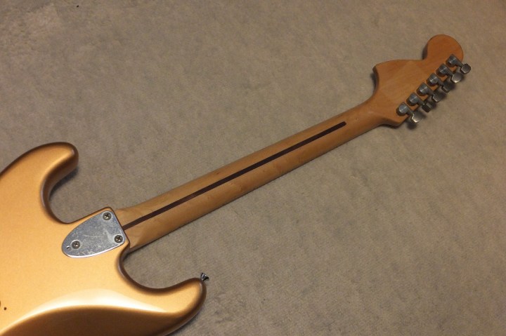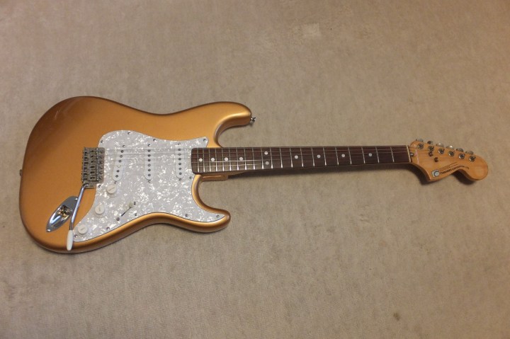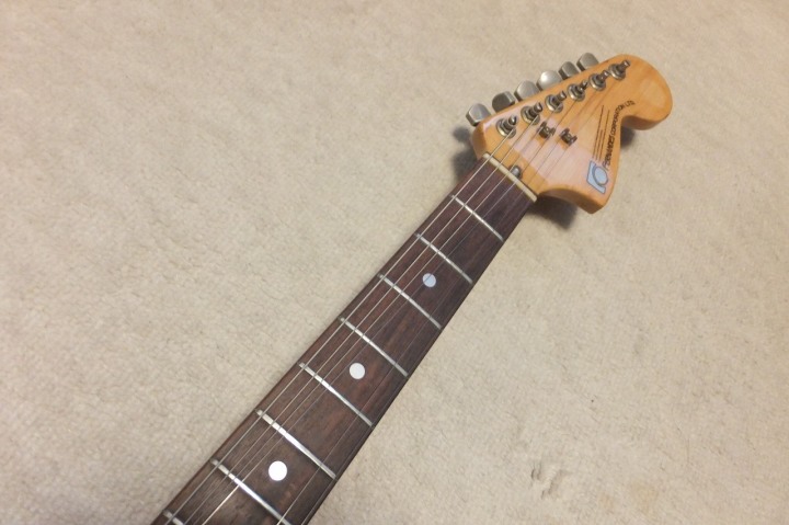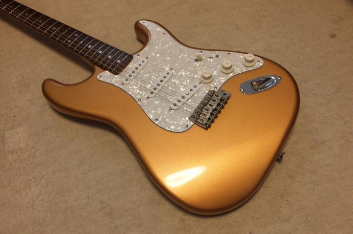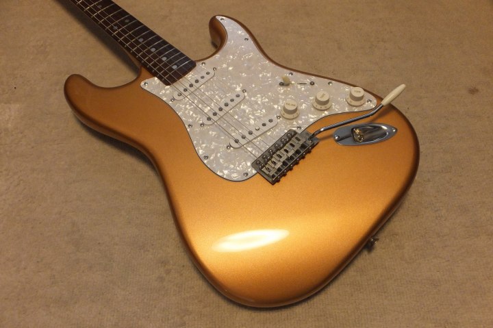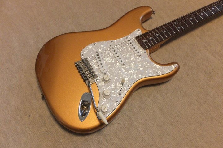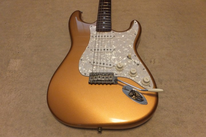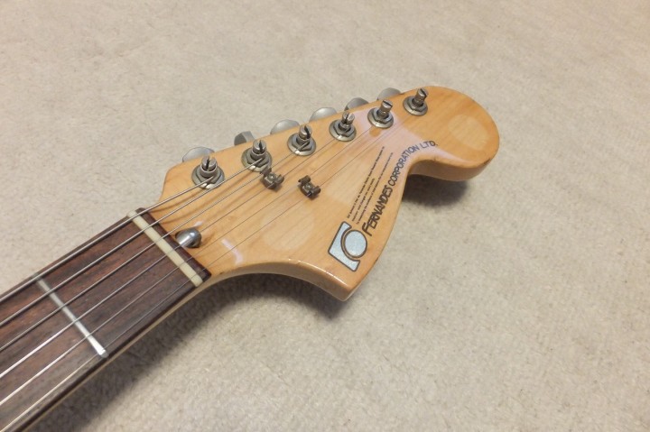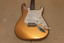 | Fernandes 1978-79 Tokai made Stratcaster model This is one of high rate evaluation guitar by many professional people. Fernandes made this model by the time they started the revival series. Japanese collectorssaid "Stone Logo" type. This gold color is repainted at the factory in Nagano which are sub-constructor of Fujigen, Sugi and others. I asked them to re-paint. Well. originally it was black color but paint was damaged so much. So, I asked them to use gold color which is exactly same with LP Gold Top. The body is SEN wood. It is 3.89Kg. The neck is maple 1P, Rose wood finger board. The nut width is 40.4 mm. The neck grip is stndard C. Well, the neck is straight no twisting. Maybe you could feel a bit thin compare with Fender Japan Start. The frets are proper condition. Electric circuit and PU are all changed. I put the Gotoh PUs, but not standard. I asked them to use enamel wire (US Made) and Alnico 5. These PUs could show you really good tone. We are offering this special made PU for domestic market now. Well, we put the brand new white pearl pick guard. Around the logo mark on the neck head, we could see some color differents. The previous owner put the stikcers on. So, got a bit sunburn. We are going to ship this guitar with soft carrying case. This is a good modified JV guitar! Enjoy it! |
