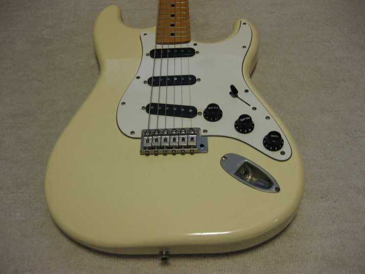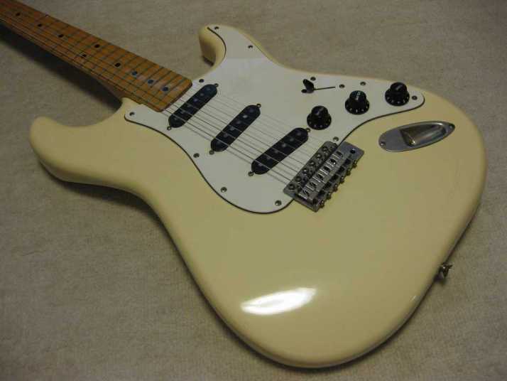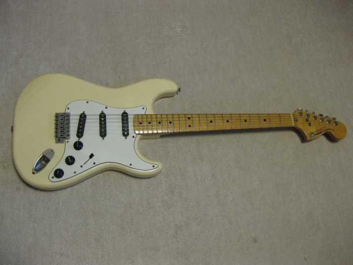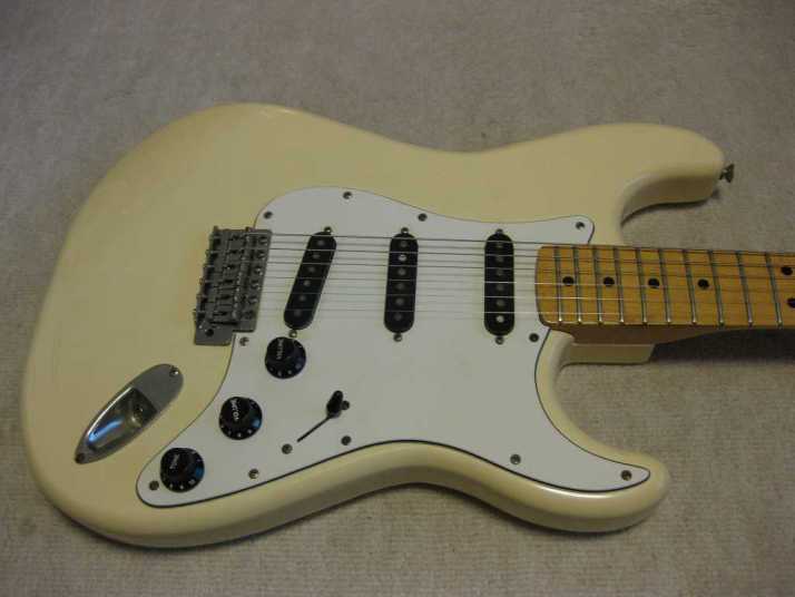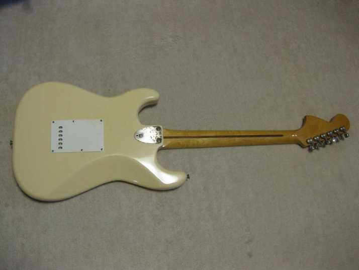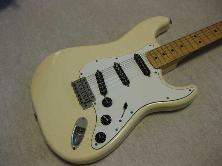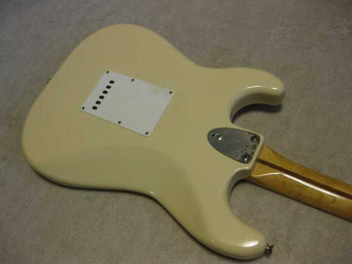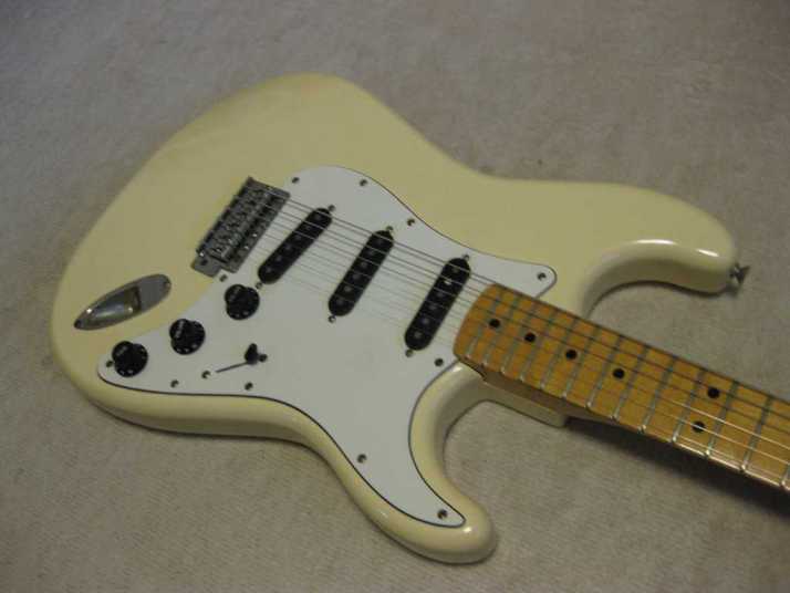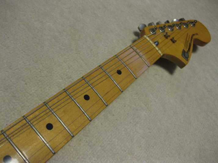 | Fernandes 1978-79 Tokai made Stratcaster model This is one of high rate evaluation guitar by many professional people. Fernandes made this model by the time they started the revival series. Japanese collectorssaid "Stone Logo" type. The body is SEN with good wood pattern. It is 3.85Kg. The neck is maple 1P, Rose wood finger board. The nut width is 41.7 mm. The neck grip is stndard C. Well, the neck is straight no twisting. Maybe you could feel a bit thin compare with Fender Japan Start. The frets are proper condition. Electric circuit and PU are original condition. The outlook is not so so...but it is over 30 years old guitar. Please do not expect the brand new guitar. The paint of neck pocket is cracked a bit. We are going to ship this guitar with soft carrying case. This is a good JV guitar! Enjoy it! |
