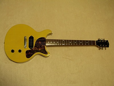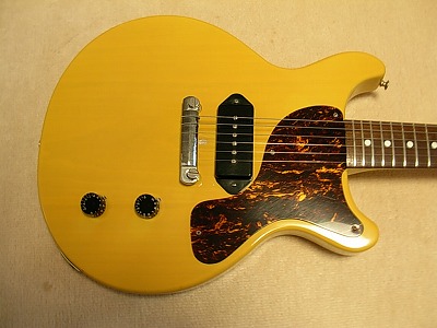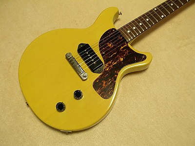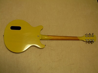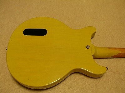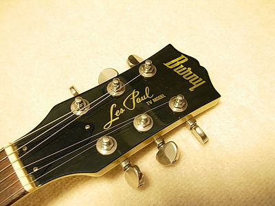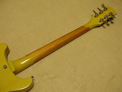 | Fernandes Burny TV Model 1973-74 made This is pretty old TV model. I have 2 pick up type. This single PU type is also nice looking. The neck, frets and electric circuits are all fine. However, previous owner peel off the paint of neck behind. I don't know reason why. The neck is not re-shaped, almost original shape even compare with my other stock. Maybe just change looks good. The paint off area was painted by clear lacquer. The tuner is Grover old model. I think Bridge is origonal. Output Jack has a bit noise, I think you had better change it. (If you would like to change it to switchcraft, just let me know) The sound is beautiful, pretty much like TV. like Mountain. Please try 70's Burny TV model. |