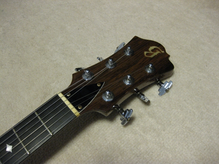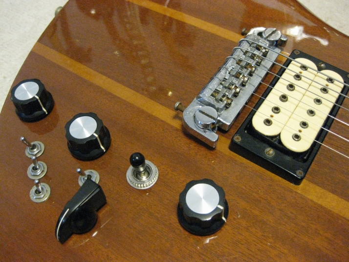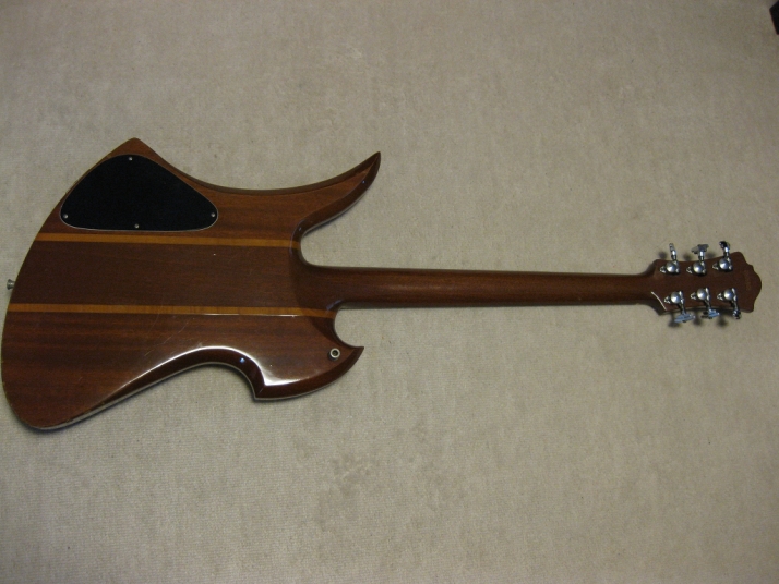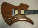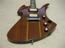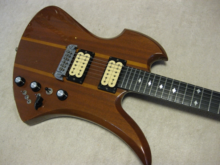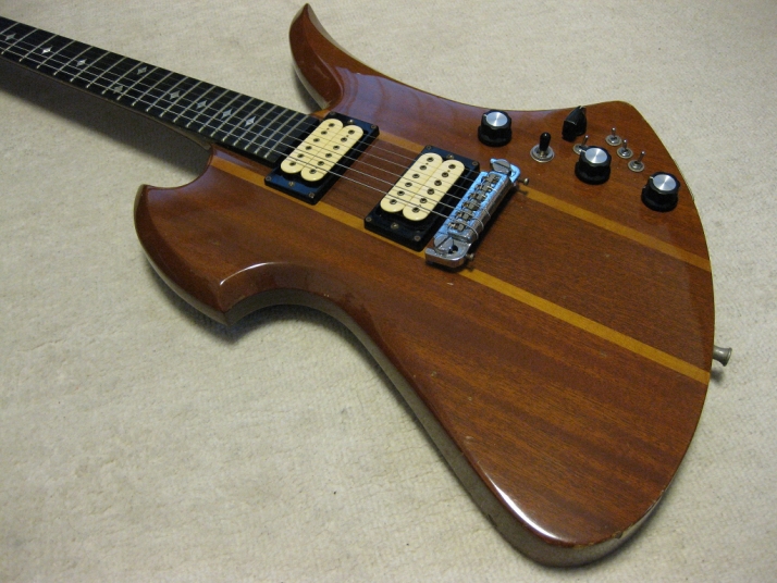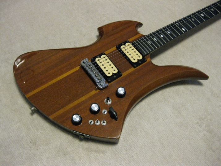 | GRECO BC Mockingbird Replica Mahogany Body I'm collecting the B.C. Rich replica, Fernandes, Aria, Greco and Kasuga made. This is all Mahogany body Mockingbird replica. From serial number, we could specify this is made by Fujigen in 1980. So, it is over 30 years old guitar. According to the Kanda Shokai, they didn't offer this model on their official catalog. It should be made for the custom guitar shop made guitar. I could see the same guitar on WEB site (Japanese collector's). The serial is very closed. Probably, Kanda made the same guitars several units. I could remember that sometimes Kanda Shokai Sales brought the limited model and asked us to stock when I was a part time shopkeeper. I have the Hawaiian Koa made Aria Pro-II Mockingbird. I feel this Maho body is providing a bit dry tone. The neck is 1P (GRECO BC-1300 is 3P around neck head) with ebony finger board. The nut width is 43.45 and flat (thin) feel neck. The body material is Maho solid with 3.14Kg. It is pretty light weight. The tuner is Grover 109 Imperial. The bridge is probably Badass. I didn't check the PUs detailed, however, it should be Dimarzio Dual Sound. It looks like (I don't have an intention to sell this guitar, so, I didn't open yet). The scratches and dents are on the body. Well, it is not great looking. But for 30 years guitar, I could tell it is Mint as my evaluation. The extra holes are on the bottom for the strap pin. This is not sales item. Just have a look for fun! |