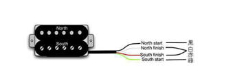 ハンバッカーのリード線は5本出ています。以下の様に黒・白・赤・緑の線があり、この他にハダカ線がアースとしてあります。出荷時には、白と赤が結線されております。したがって、通常の配線時においては、黒と緑をホット、コールドとしてご使用ください。STクラッシック、TLクラッシック等その他の