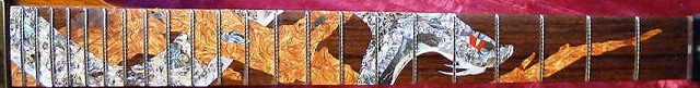 “Basically, an inlay is a puzzle that the artist cuts all the pieces for, then routs (or grinds, chisels or gnaws) out a corresponding hole in the host material (usually wood, but possibly stone, metal, plastic, etc.), and glues in flush with the surface. After filling any residual pits and sanding smooth, the inlay might have some final details engraved on it, and the lines inked. “.