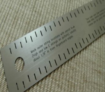 より簡単になります。両端1弦と6弦の位置を決めます。その溝位置と同じ幅に合わせると、残りの4弦の溝が簡単に決められます。あると便利な、あまり売っていないスケールです。ナットの溝切りには本当に便利です。