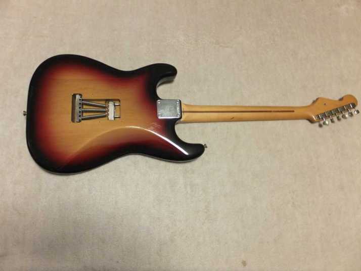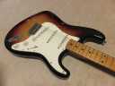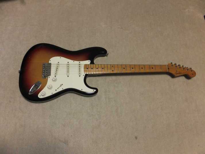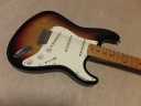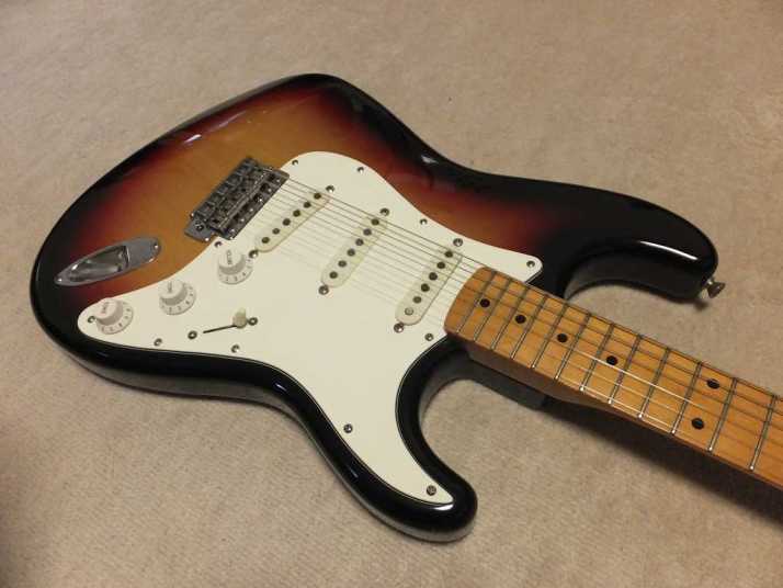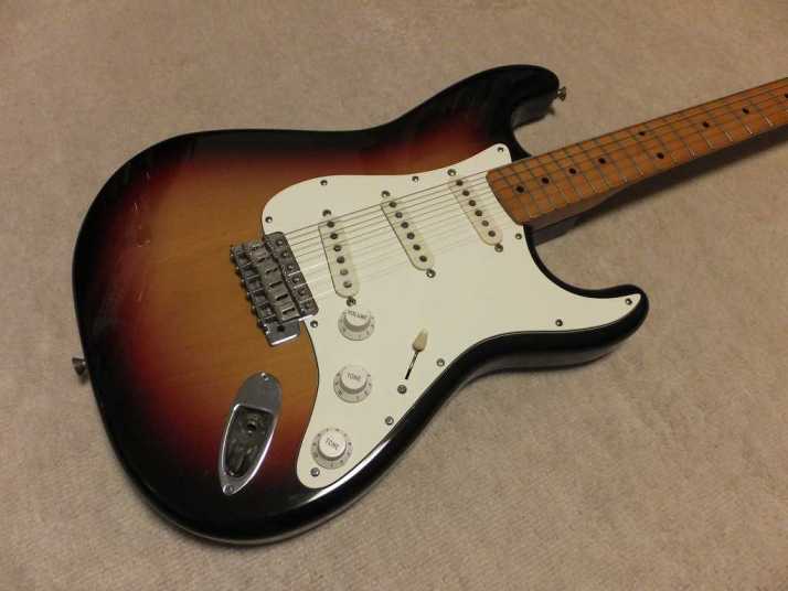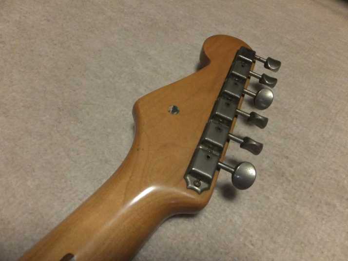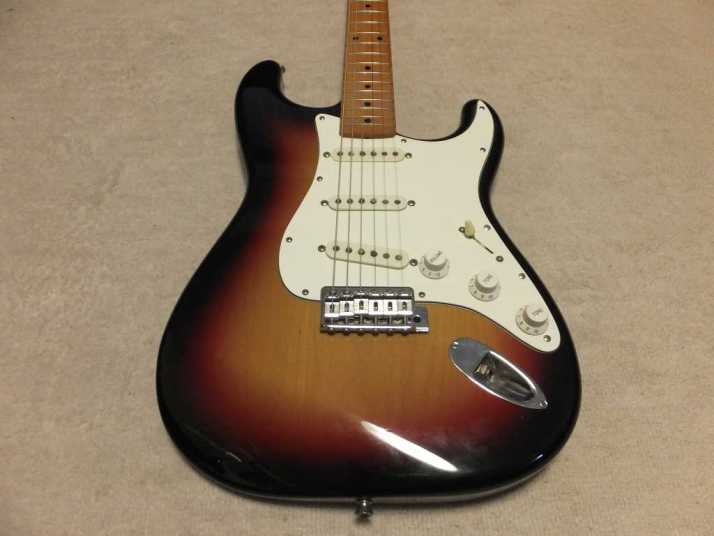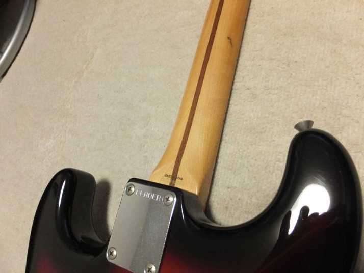 | Fender Japan MIJ E Serial Fujigen made Stratocaster 62 This should be early time (maybe 1986) E serial Strat 62 model. I have been using this guitar for monitoring purpose here. Therefore, some parts are replaced. I did many years ago, so I'm not sure but 1) Oak Grigsby 5 way Switch 2) All CTS pot 3) Mojotone Oil Filled Capacitor 4) Switchcraft Jack 5) Belden wire with WBT soldering (silver coated) 7) Steel Block ( Music-Trade original) Can be modified with 8) Pickguard (Mojotone Original) This body looks like alder but I'm not sure. Well, the sound is pretty good. I have put the Gotoh ST classic Alpha on middle. The neck and bridge are original which have a cloth wire. Probably USA made. 24 years old strat closed to JV serial model. The weight is 3.59Kg. The 1P neck is straight and truss rod is adjustable. 42.05 mm nut width. Well, the grip is standard C type. If you are looking for early time Fender Japan with proper up-grade, this is it. Well, Good guitar ! Find out the good JV guitar! . |