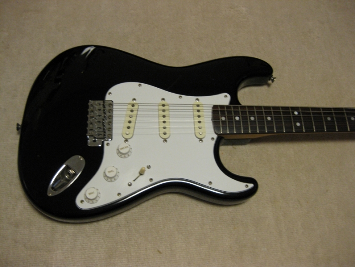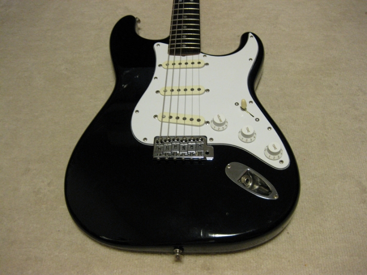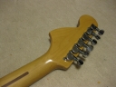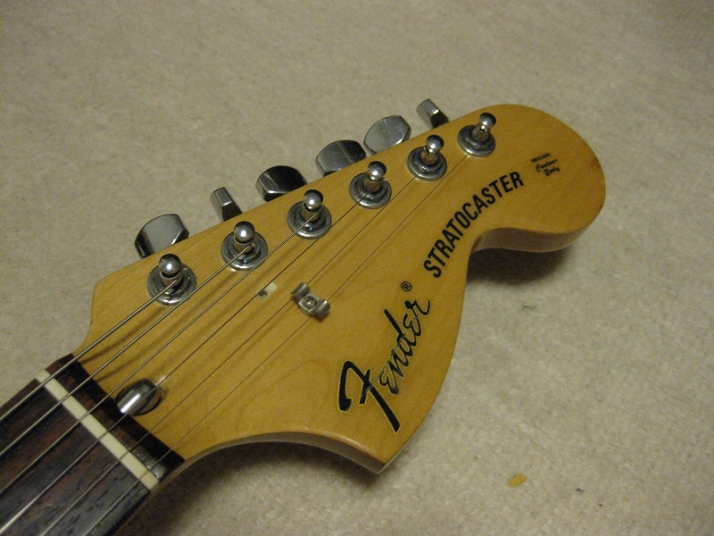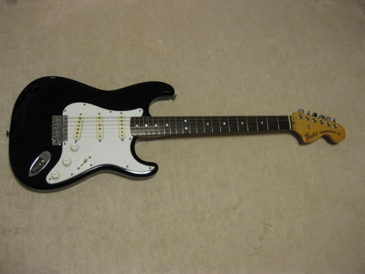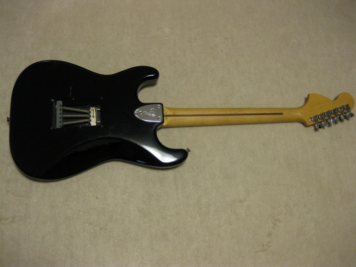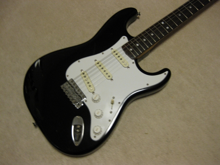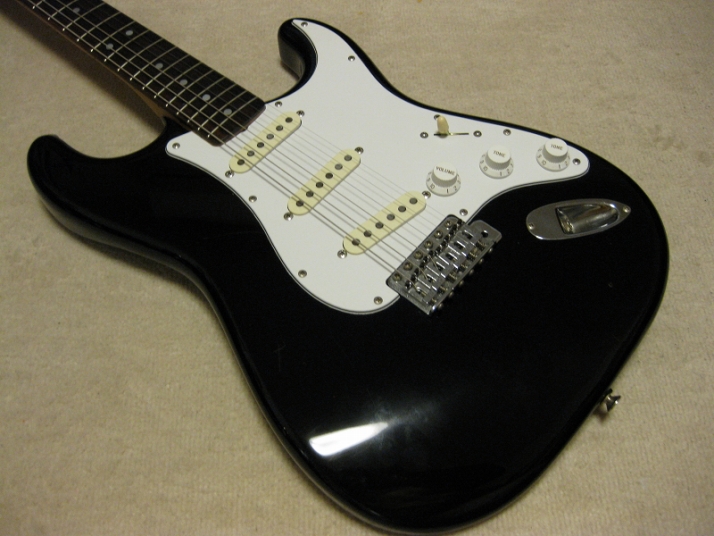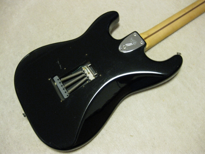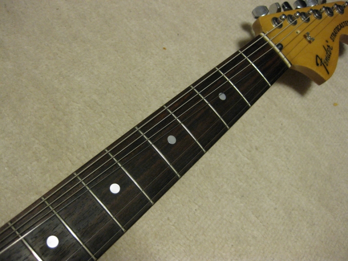 | Fender Japan MIJ E Serial ST72 model This is E serial Rose finge board ST72. It is fair condition. The body has many scratch and dents like vintage guitar. People like the vintage looks, but I just evaluate it as fair. The neck is straight. There are no problem for playing. The frets are worn spcially 2-3 string low frets. I could say it should be 65%-70%, if I said the band new is 100%. You don't need to refret now. The fingering is smooth. The neck behind were mat finish now. It maybe polished by #1200 sand paper... The 3-4 string guide were missing There are small extra hole. I guess the owner put the different string guide on. The body material is probably ash 3P (there are some possibilty, it is basswood). I could not specify becasue of color. It is 3.64Kg The nut width is 42.7 mm. I saw white body + Rose finger board model often. Black body is very seldom to see. But it is good looking. We are going to ship this guitar with used gig bag. Well, Good guitar ! Find out the good JV guitar! |