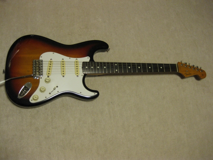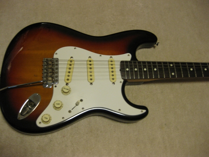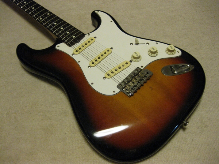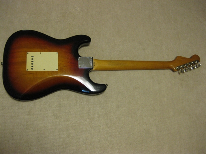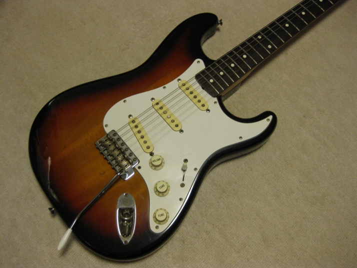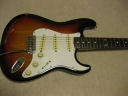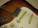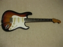 | Fender Japan ST62 Sunburst MIJ E serial This is a good condition of E serial. ST62. Of course, Fujigen made. The neck plate has the Fender Pressed mark. This is made by Fujigen. 23 years old guitar, anyway. The body should be basswood (I don't think this is alder) in 3P. The neck is 1P with rose. The weight is 3.7Kg. The neck is O.K., the frets are proper condition. The nut width is 42.6mm The outlook is generally good. On the top, there are small dents are. The electric circuits are probably original, I felt when I saw inside. PU is Fender Japan original (should be Gotoh made). The tone is typical strat sound. I feel it is clear tone. The guitar will be delivered with Soft carrying case (not original) If you are looking for High end Fender Japan, this is it. Well, Good guitar ! Find out the good JV guitar! |