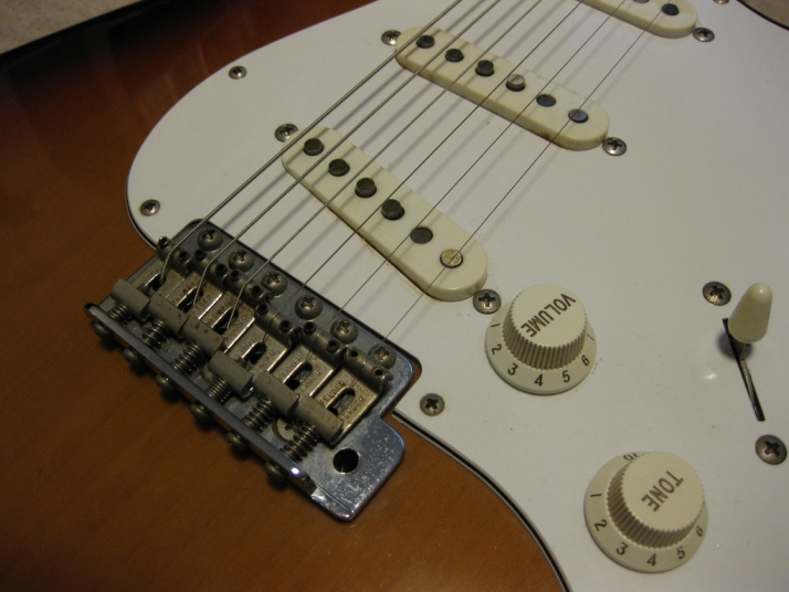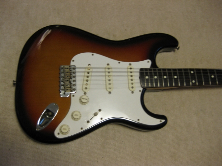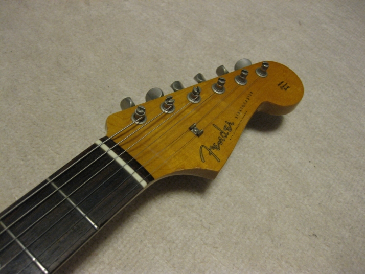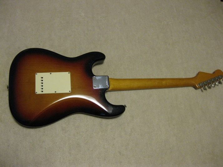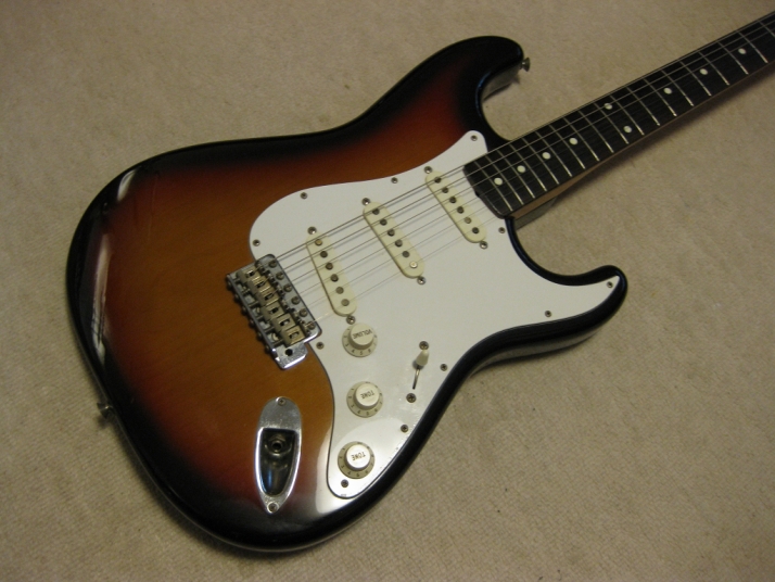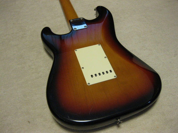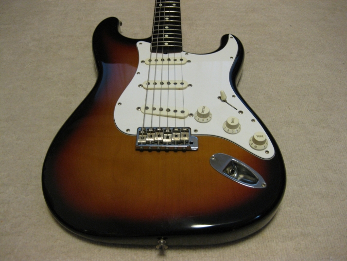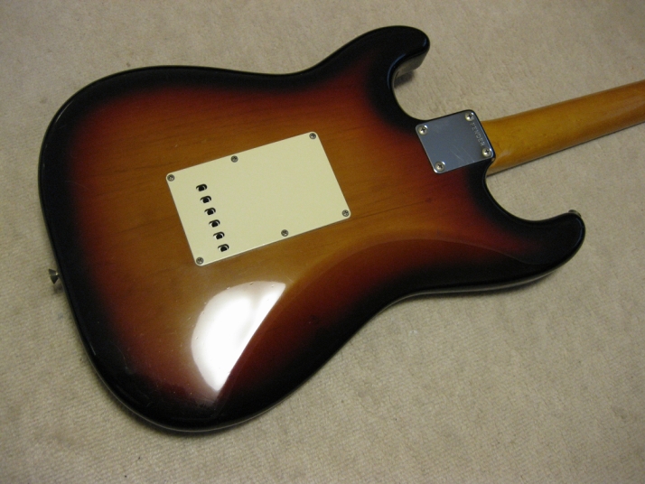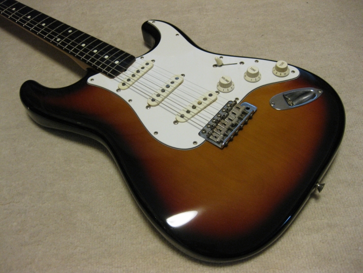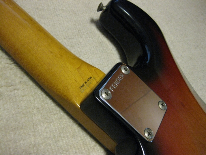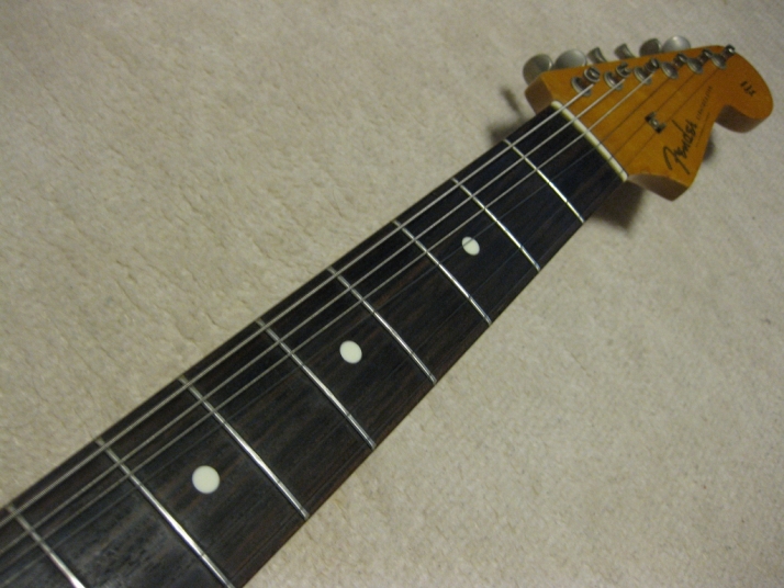 | Fender Japan ST62 Sunburst MIJ F serial This is a good condition of F serial. ST62. Of course, Fujigen made. The neck plate has the Fender Pressed mark. This is made by Fujigen early time made. The body should be Alder (I don't think this is Basswood) in 3P. The neck is 1P with rose. The weight is 3.36Kg. The neck is O.K., the frets are proper condition. The nut width is 42.45mm The outlook is generally good. The electric circuits are probably original, I felt when I saw inside. PU is Fender Japan original (should be Gotoh made). The guitar will be delivered with Soft carrying case (not original) If you are looking for High end Fender Japan, this is it. Well, Good guitar ! Find out the good JV guitar! |
