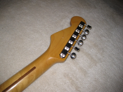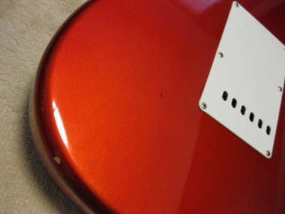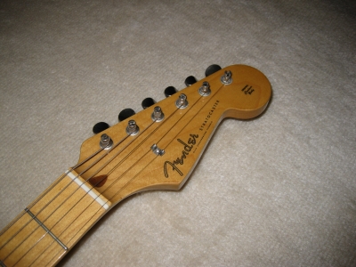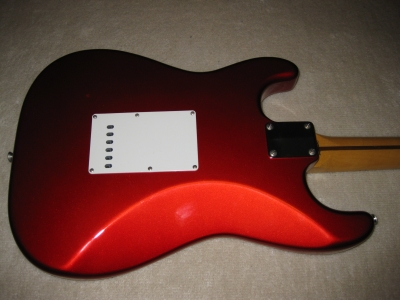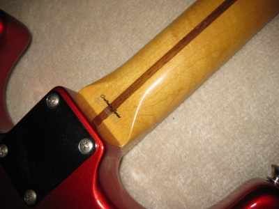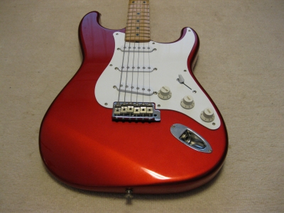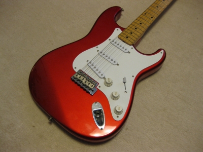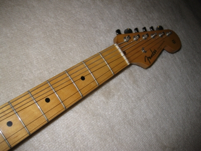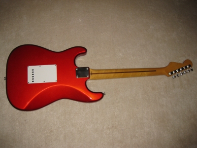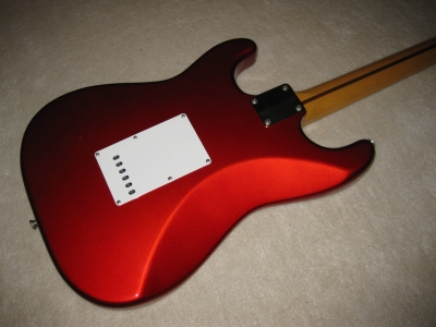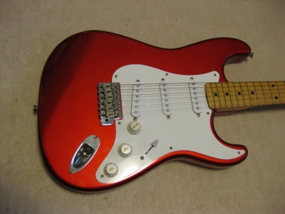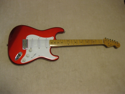 | Fender Japan Stratocaster 57 model This is not really old but good condition cabdy apple color Strat. Probably, Dyna or Tokai made this strat. The neck, frets and electric circuits are all fine. It's good condition. There are not serious dents and scratche, only at the bottm, about 2mm dia dent. as showing on photos. This guitar is completely checked and you could pay it when you get it without any stress. The neck grip is C-shape. I think standard Strat grip The body material should be basswood. 16 years old guitar? as I said, this is good condition. Well, good sound too.. I We are going to ship this guitar with used soft carrying case. If you would like to have a hard case, please ask us. We could only offer the brand new case. Please try Fender Japan ! |