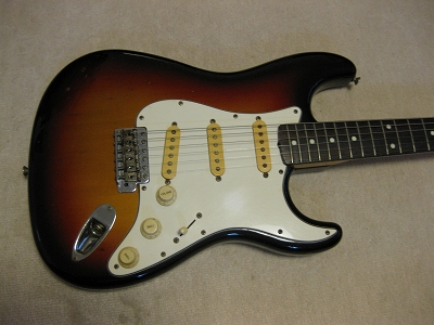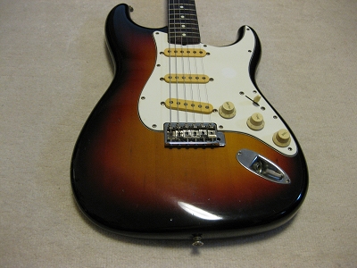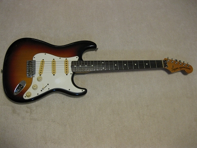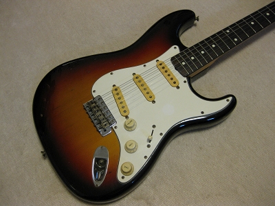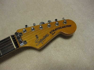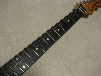 | Fender Japan Squire MIJ A Serial Stratocaster 62 This is very early time Squire 62 model. According to their catalog, this guitar body is alder 3P... It looks like, But I'm not sure it is. It is 3.38Kg. Well, there are some possibilites it is alder 3P. Anyway,Generally good condition ST. Only I don't like that it has string lock device. Well, these days, this guitar were selling, this type of strings lock were pretty popular. Maybe the owner of this guitar took it as accessoriy. The body condition is good. no so many dent and scratches. The neck is fine with standard C grip, the frets are not really worn, still fine. No Modification, all original condition except string lock device added. The metal parts are bit rusted as 15 years old guitar. But, these are functionally fine. Well, Good guitar ! If you like to purchase good time FJ strat, this is one! |