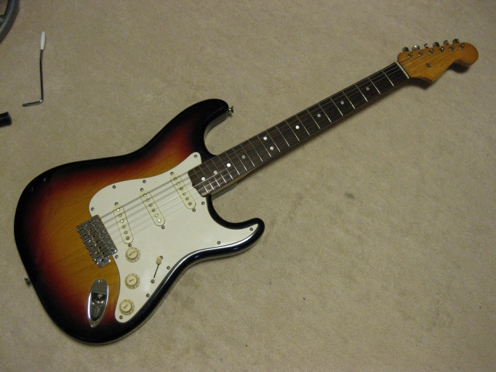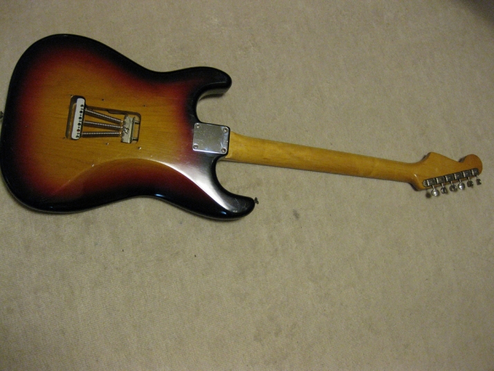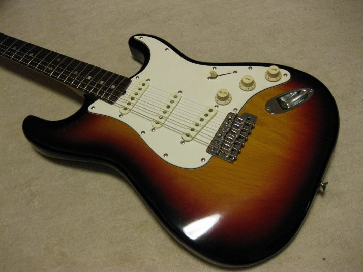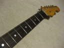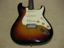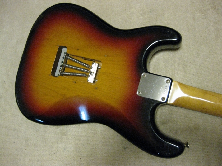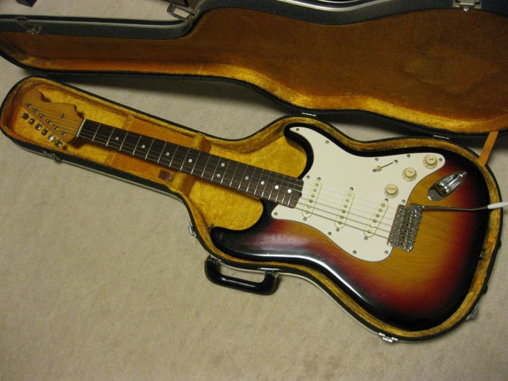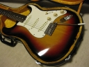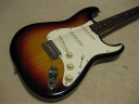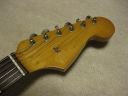 | Tokai Stratocaster Goldstar Sound 1983 made This should be 1983 made Goldstar Sound TST-50YS. We estimate it from the serial number and specification of this guitar. Very regretfully. previous owner modified this guitar a bit. The logo mark were took off. He maybe put the bar type string tentioner. So there are holes to set these. The bridge and jack plate were changed too. I don't like the quality of them and change it to Brand new Gotoh bridge and plate. I didn't check the wiring. These are original condition with U stamp gray bobbin PU. The pickguard screws are all changed to stainless made. Beside these, this guitar is good condition. The neck is O.K. and truss rod is working. The frets are proper condition. The body? Well, these areno so many dents and scratches. Of course, the neck and body are Tokai original. I like this guiatr even rebuilted. Good tone... We are going to ship this guitar with used hard case shown on picture. It is not Tokai original. However, 70's made hardcase. We will ship Gotoh Tremolo arm. Please try JV guitar! |