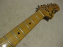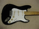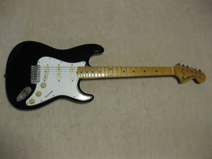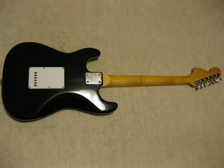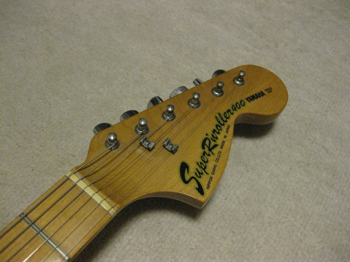 | YAMAHA SR-400 Stratocaster This is fair condition SR-400 Black. NO Modification. The reason, I rated "Fair", because this guitar has paint crack from the neck pocket. I have checked it carefully, but I could not confirm the wood is fine. Maybe around the neck pocket, the wood has a but cracking. But I'm not sure about the body. Except this cracking, this guitar is not so bad. The neck is 1P + MFB (the head part should be 2P) straight, the frets are proper condition. The grip shape is like C. The Body is SEN 2PLY 3-4P old fashion construction. The weight is 3.7Kg. The metal parts are generally fine. The electric circuit are good condition. I love Yamaha SR startocaster. Well good tone and reasonable price compare with other JV guitars. But, it is getting increasing now. The collectors are getting aware the value of SR guitars. If you have any idea to modify the guitar, this guitar could be good material. I thought I put the spolted Maple on the top. The Tremolo arm and Gigbag (used) will be shipped with this guitar. Please enjoy Yamaha Vintage SR |