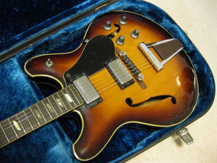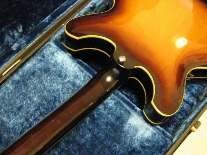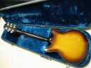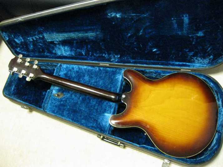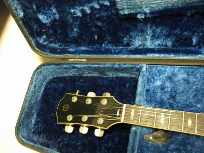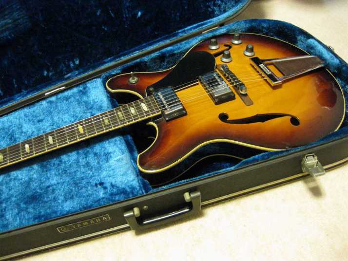 | YAMAHA SA60 1973-77 made Semi-Acoustic Guitar Yamaha developed many original guitars against Gibson and Fender during 70's. Late 70's, they changed the policy and made Strat and Les Paul replica. However, by that time, they were always looking for the original design. I think they did those as a pound of NO.1 musical instruments manufacturer. Early SA series have a serial numbers at the end of finger board. This guitars serial is starting from 2, so I could estimate it was made in 73 or 74. The catalog data didn't tell us the detailed. It said Price : JYE 65,000 Finger Board : Rosewood Neck : Maple Tuner : Yamaha Original Diecast The body is probably laminated Sycamore wood. Most of semi-acoustic guitars used it. About the sound, you could get some sample on WEB. This guitar shows very sweet tone. I like the neck PU tone. It is more sweet than Gibson ES-335 or later Yamaha SA series. Well, suitable to use for Jazz music. The condition is fair. The body has a bit dents and scratches but not really serious. I think for wood construction hasn't got any damage. The set neck condition is well. No paint cracking around connection part. NO parts missing. I have changed only strap pin. It was missing. Beside this, I think this guitar fully original. The hard case is also Yamaha Original SA case. Many people look for vintage SA60 or SA90. This is one of good condition SA60. |