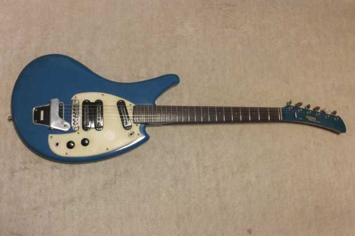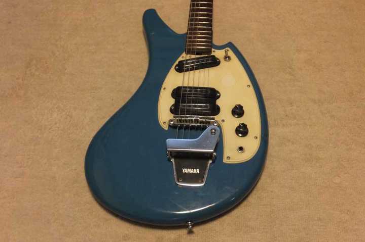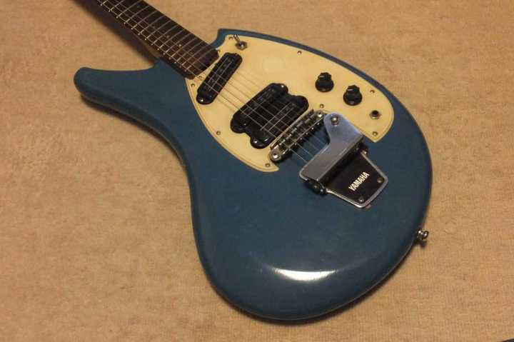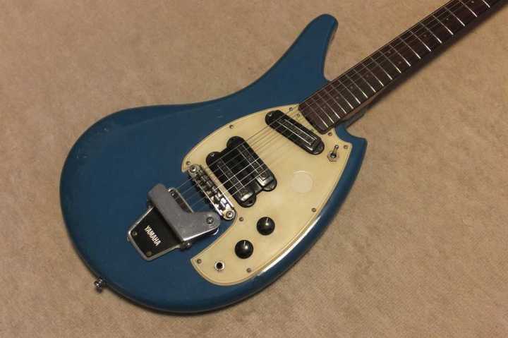 | YAMAHA SG-3C Guitar (Egg Plant Guitar) This is Yamaha SG-3C guitar. Here, many people call this guitar as an egg plant guitar. Overseas people call this guitar as a Banana guitar. Anyhow, this guitar is very unique designed. But it is very tough to play, when you sit down on chair. It was part of a small group of original designs introduced by Yamaha in 1968, these included the Yamaha SG-5A. However, both guitars were completely different design. The SG-3C has a bolt-on maple neck, rosewood fingerboard. The machine heads were open geared types, and chrome plated. It had 22 frets, plus a zero fret - with an overall scale length of 630 mm. It is 3.75 kg. Pickups look like two closely spaced single coils (probably combined as a humbucker) at the bridge and a single coil at the neck. These are controlled by volume and tone knobs and a three-way selector switch. All are mounted on a white plastic pick-guard. The condition of this guitar is proper. The control knobs are replaced. Maybe the tremolo spring was replaced too. The tremolo arm is missing. The electric circuit are fine. The neck is proper condition. The frets (0 fret) are worn but still O.K. for playing. The nut width is 42.3mm No idea about the body material. It should be Nato wood Yamaha used a lot. The neck is maple. Well, JV history teller guitar. Please enjoy Yamaha Vintage SG |