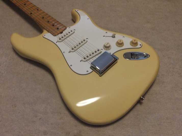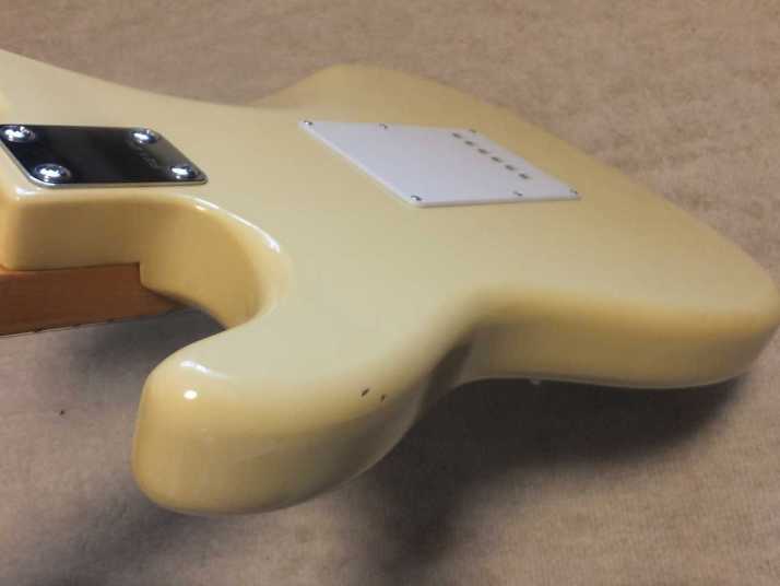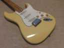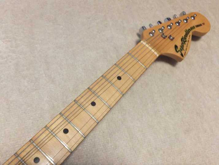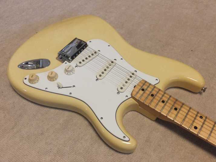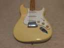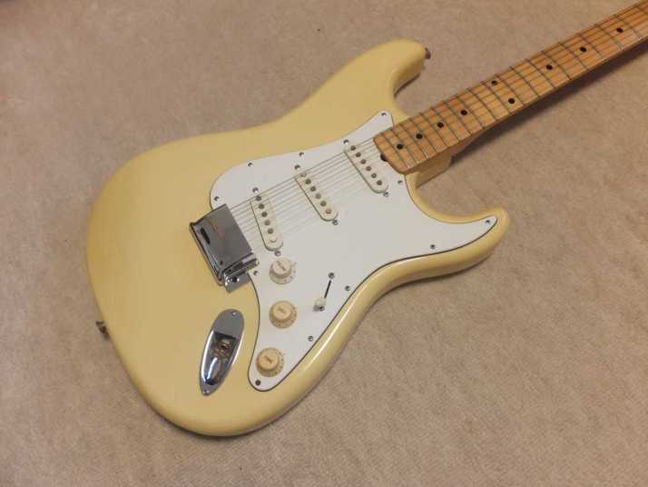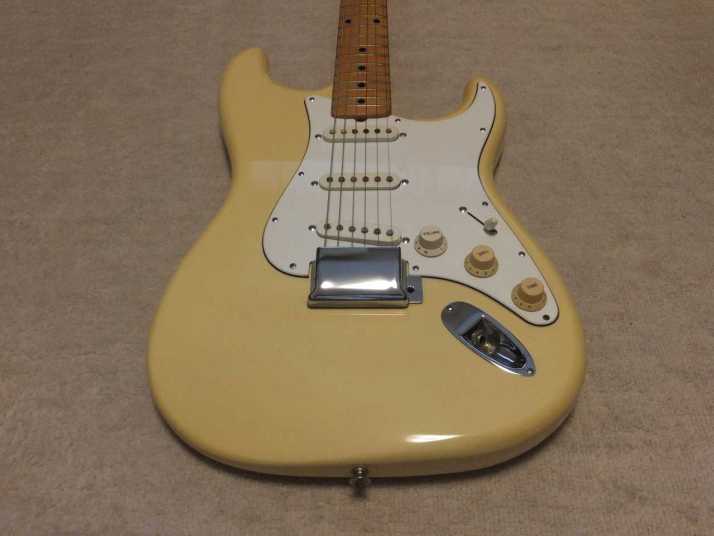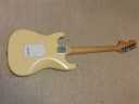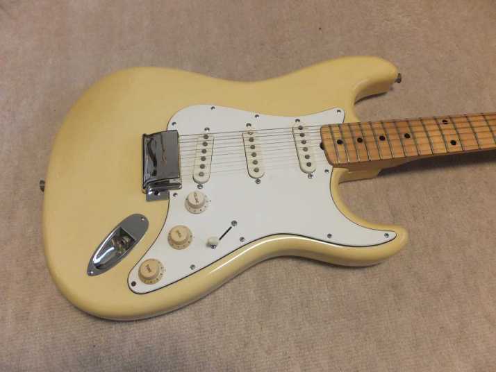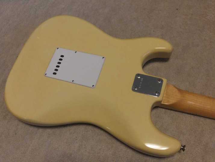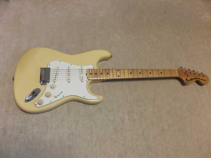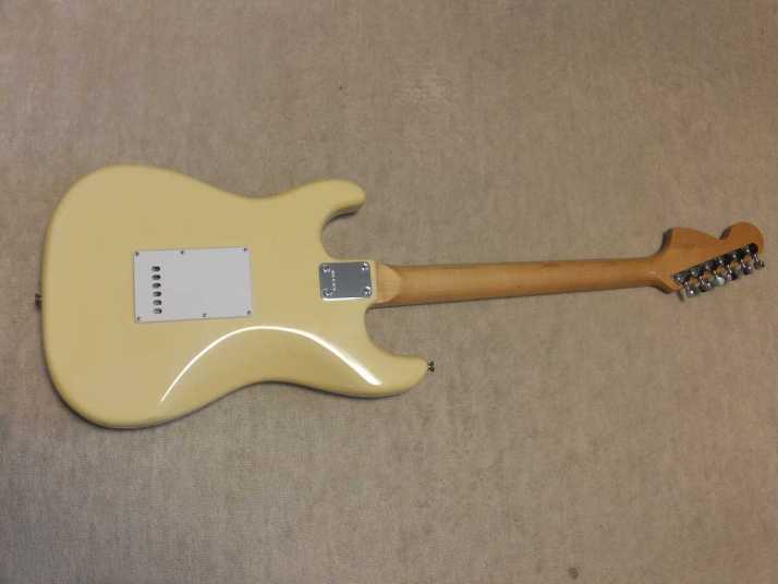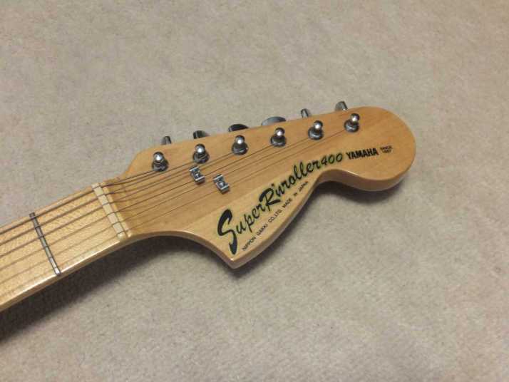 | YAMAHA SR-400 Stratocaster This is a mint condition SR-400 white. NO Modification. The body outlook is good, there are very few dents (like 2mm dia dents are 2, indicaed ob pics.) However, a part of logo mark is peeled off a bit. The neck is straight, the frets are proper condition. The grip shape is like C. SR-400 is 1P neck but the head is 2P. The finger board is good looking rose wood.. It is 41.6mm as nut width. The Body is SEN 2PLY 3-4P old fashion construction. The weight is 3.9Kg. approx. Only 2 dents are body side The metal parts are fine. The electric circuit are good condition too. I love Yamaha SR startocaster. Well good tone and reasonable price compare with other JV guitars. Well, several professional people use this guitar The Tremolo arm and used Gigbag will be shipped with this guitar. Please enjoy Yamaha Vintage SR |