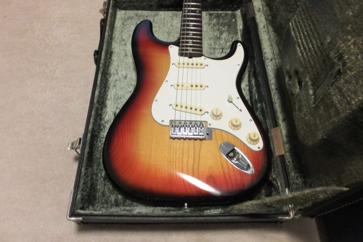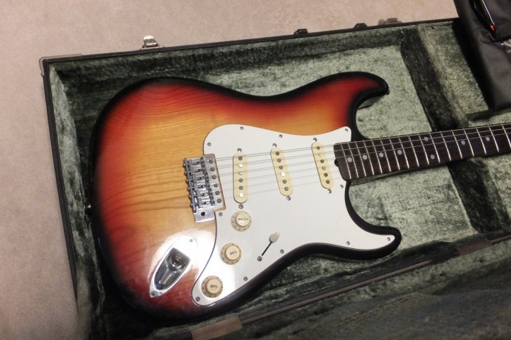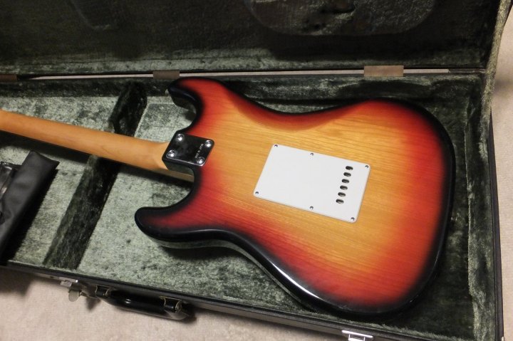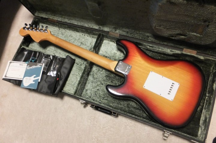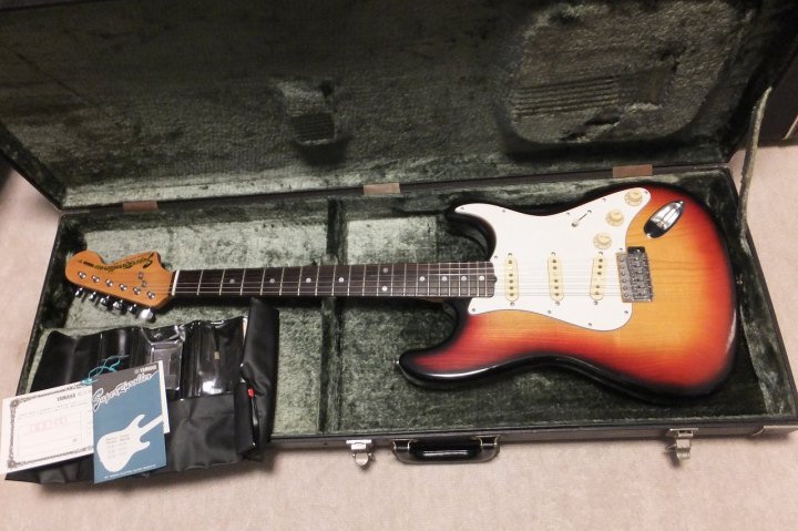 | YAMAHA SR-400 Stratocaster w/Original Hard Case This is a good condition SR-400 Yellow Sunburst. NO Modification. The body outlook is good, there are a few dents and scratches. These are not really visile. The neck is straight, the frets are proper condition. The grip shape is like C. The finger board is Rose wood type. It just like vintage Strat fingerboard with 41.6mm nut width. The Body is SEN 2PLY 3-4P old fashion construction. The weight is 3.98Kg. Rose wood Finger board is rare for this time SR series. The metal parts are fine. The electric circuit are good condition too. The strings tuner are bit tight. Maybe need some lubricant and frequent using. I love Yamaha SR startocaster. Well good tone and reasonable price compare with other JV guitars. Well, several professional people use this guitar This guitar has the original warantee card, maintenance kit and tremolo arm. Yamaha original hard case will be shipped with this guitar. Please enjoy Yamaha Vintage SR |