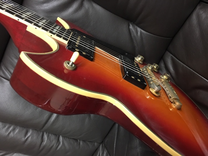 | YAMAHA SG-1000 1982 made Yamaha started SG series (same shape with current SG) in 1974. The line up of this SG series are SG-175, SG-90, SG-70, SG-50 and SG-35. After that, they started SG-2000 though neck type , a bit later, they added SG-1000 as set in neck type. I think SG-1000 was most popular model. No Idea how many Yamaha made. However, now, we could not see the good condition Yamaha SG-1000 even in Japan. Yes, you could see them sometimes on auction site. But very regretfully, most of them are very poor condition and need much works after purchase. This SG-1000 is pretty good condition.The outlook is generally fine. Most of Yamaha has paint problem. The clear top coat became cream, not transparent. This guitar is fine. I have checked all and just did a few mentenance works. The neck is straight, and truss rod is workable. The frets are generally fine. Pretty good condition as 37 years old guitar! You could try it! |