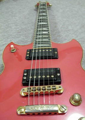 | YAMAHA SG-1000-24 1983 Made MIJ JV It's a very rare color Yamaha SG-1000-24. From serial, it should be made in 1983. I have checked the data of Yamaha SG, but Yamaha only offered Cream white and Red Color on their catalog. This model was developed based on SG-1000N, therefore the body thickness should be 48-49mm. However, this guitar has 52mm thickness The color/thickness are different from catalog, but serial number is showing 1983 made. Probably, custom made or very few test color products Scale : 628mm(24F) Control : 2V(Direct Circuit 2T(Direct Circuit w/Bi-Sound Switch) Body : Maple + Mahogany Neck : Mahogany Set Neck Finger Board : Ebony Tuner : Di-cast with Torque control (Gold) Weight : 4.1Kg The condition of this guitar is good enough as 24 years old guitar. I have checked the neck condition, truss-rod, electric circuit and other areas. Generally, all fine. Fret should be 80% level, still O.K. Major damage is on peg head. About 3X4mm dent on it. Also Pear Inlay area's top coated paint are bit damaged. The small dents and scratches are on. Please check from the photos. 3 pcs Volume and Tone potentiometers indicator plate are gone. The sound is typical SG tone. The front PU has been move to bridge side because of 24Frets board. But the sound is almost same with 22frets type When I select the single by Bi-Sound switch, I felt the output is small compare with the humbacking time. Please enjoy Yamaha Vintage SG ! |